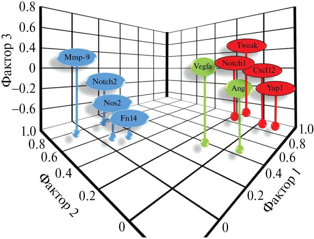 Гены Nos2 и Fn14 не вошли ни в один из факторов. Судя по факторным нагрузкам, ген Fn14 нельзя присоединять ни к одному из факторов. Согласно графику нагрузок в трехмерных координатах (рис. 2), ген Nos2 можно включить во второй фактор.