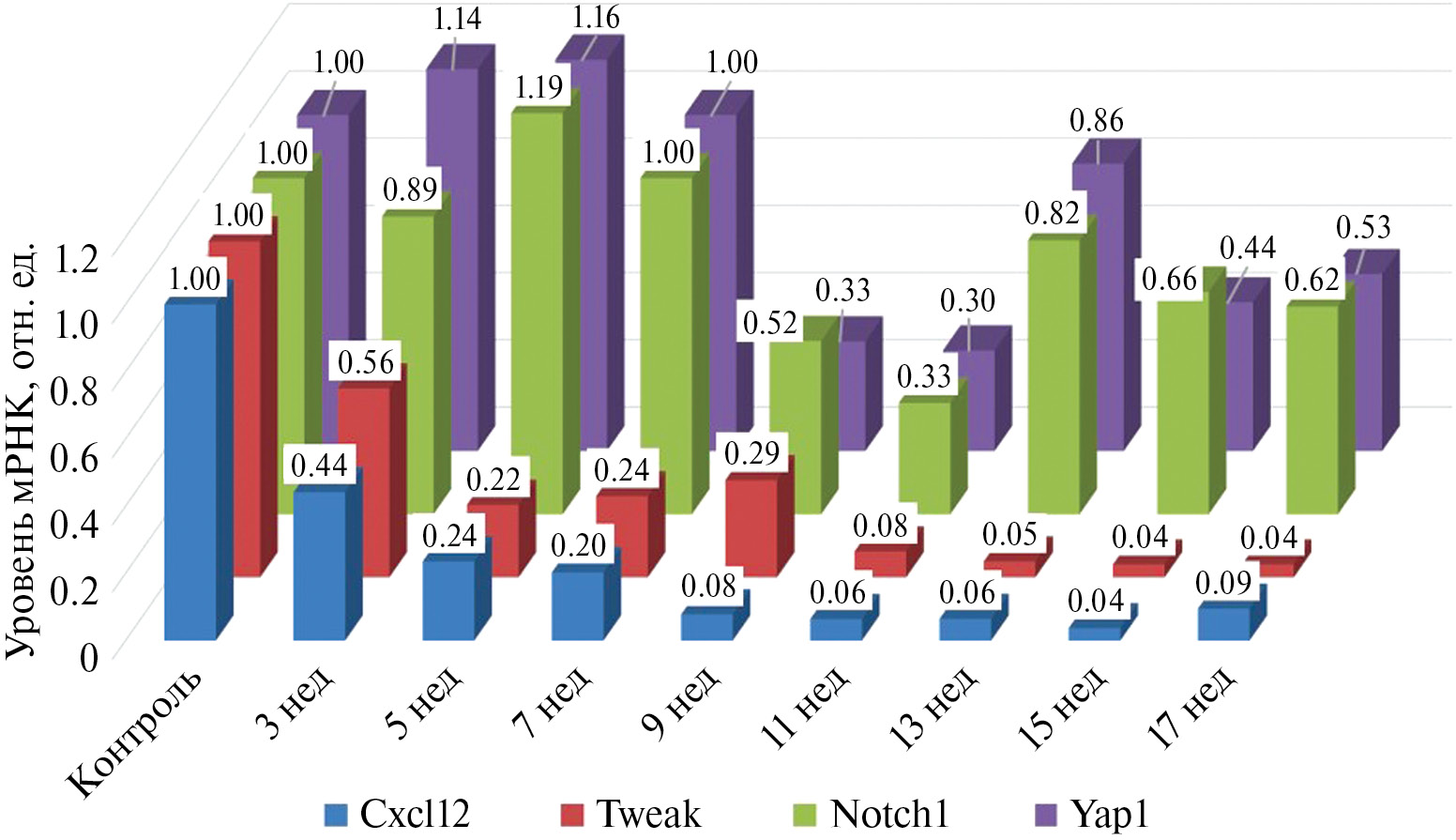 Первый фактор объединяет наибольшую долю дисперсии признаков (33.95%, табл. 3 и рис. 2) и включает четыре гена-мишени: Cxcl12 (r = 0.829), Tweak (r = 0.841), Notch1 (r = 0.848), Yap1 (r = 0.921). Этот фактор отражает взаимосвязь исследуемых генов трех сигнальных путей (Notch, TWEAK/Fn14 и Hippo) при фиброгенезе печени в рамках использованной нами экспериментальной модели. При этом следует отметить, что не все изученные гены пути Notch и TWEAK/Fn14 связаны в один фактор. Можно предположить, что гены одного и того же сигнального пути вовлечены в разные молекулярные механизмы. Уровень мРНК Cxcl12 (р = 0.0000) и Tweak (р = 0.0000) был ниже контрольного уровня на всех этапах эксперимента (рис. 3).
