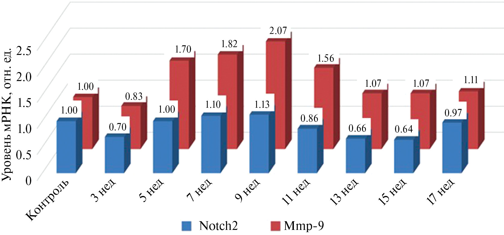 Высокие уровни матриксной металлопротеиназы 9 (ММР-9) связывают со стимуляцией фиброза и ремоделированием внеклеточного матрикса. Несмотря на значительное количество публикаций, представленных в поисковой системе PubMed, связь между ростом мРНК Мmp-9 и прогрессированием фиброза печени изучена не до конца [28, 29].