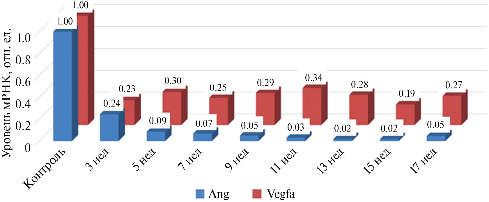 Ранее нами были описаны структурно-функциональные нарушения сосудистого русла печени крыс и, в частности, установленный венозный ангиогенез [39]. Согласно опубликованным данным, Ang и Vegfa кодируют проангиогенные факторы [18–20], но в настоящем исследовании их экспрессия снизилась.