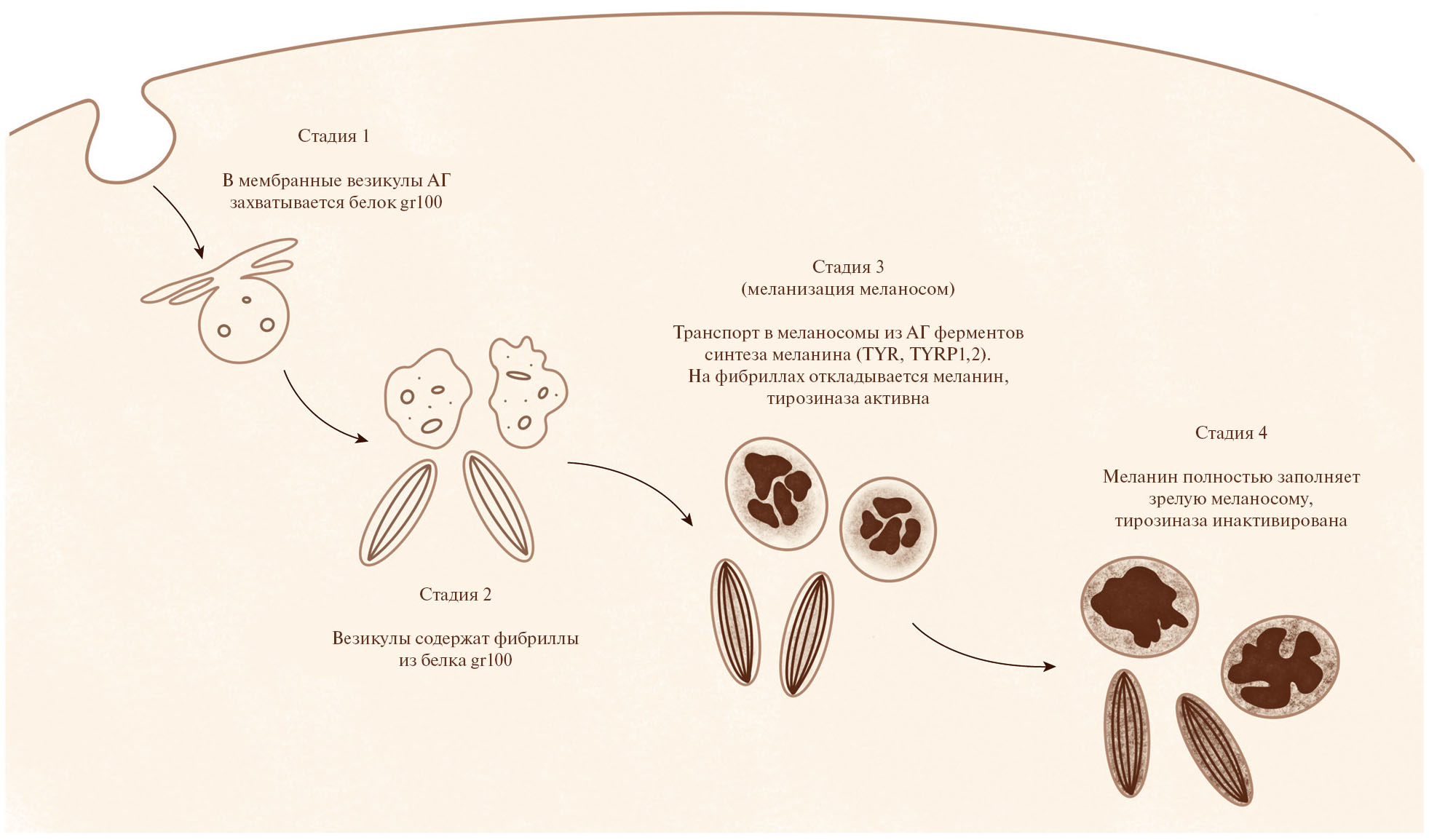 В меланоцитах синтезируются две основные формы меланина – черный/коричневый эумеланин и красный/желтый феомеланин. Синтез меланина происходит в лизосомоподобных структурах меланоцитов – меланосомах, проходящих по мере накопления в них меланина четыре стадии зрелости (рис. 1) [6].