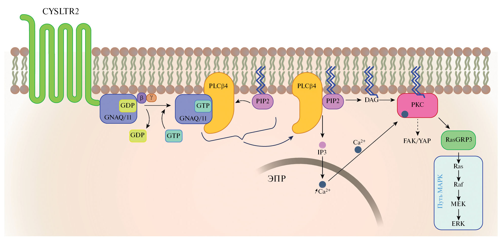 Рис. 2. Сигнальный каскад цистеиниллейкотриенового рецептора 2. ЭПР ‒ эндоплазматический ретикулум. Объяснения в тексте.