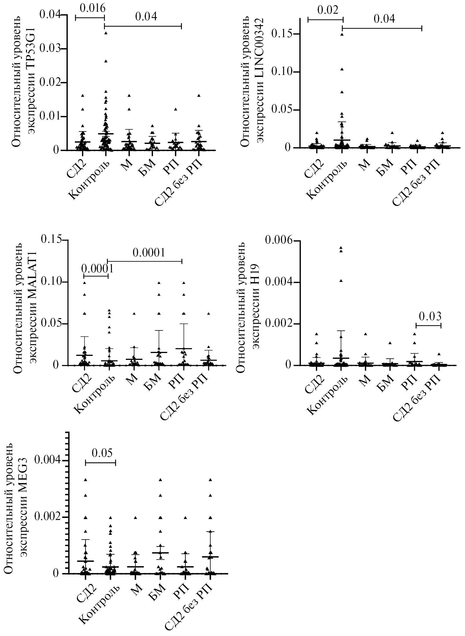 Рис. 1. Сравнение уровней экспрессии генов TP53TG1, LINC00342, H19, MALAT1 и MEG3 у пациентов с СД2, в контрольной группе, у пациентов с диабетической ретинопатией и в контроле, а также в зависимости от проводимого лечения. Величины относительной экспрессии (2-∆Ct) представлены в виде значений среднего ± SEM. М – пациенты, принимающие метформин, БМ – пациенты, принимающие другие препараты, РП – пациенты с диабетической ретинопатией.