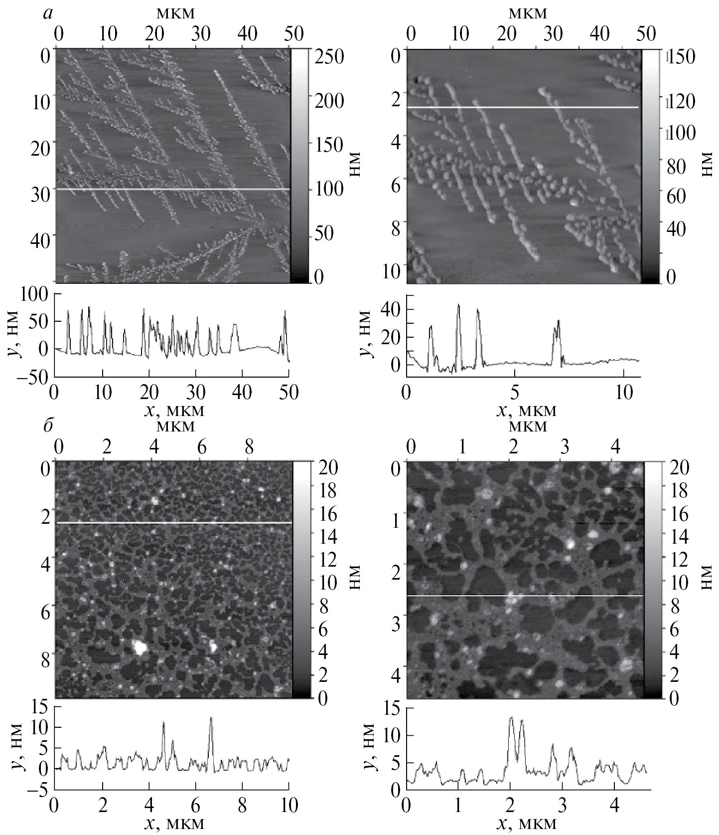 Рис. 2. Атомно-силовая микроскопия агрегатов титина. а – Атомно-силовая микроскопия агрегатов титина в растворе 0.15 М глицин-КОН, рН 7.0; квадраты 50 и 10 мкм2. б – Атомно-силовая микроскопия агрегатов титина в растворе 200 мМ KCl, 10 мM имидазол, pH 7.0; квадраты 10 и 4.5 мкм2. Время формирования агрегатов при 4 °С – 24 ч.