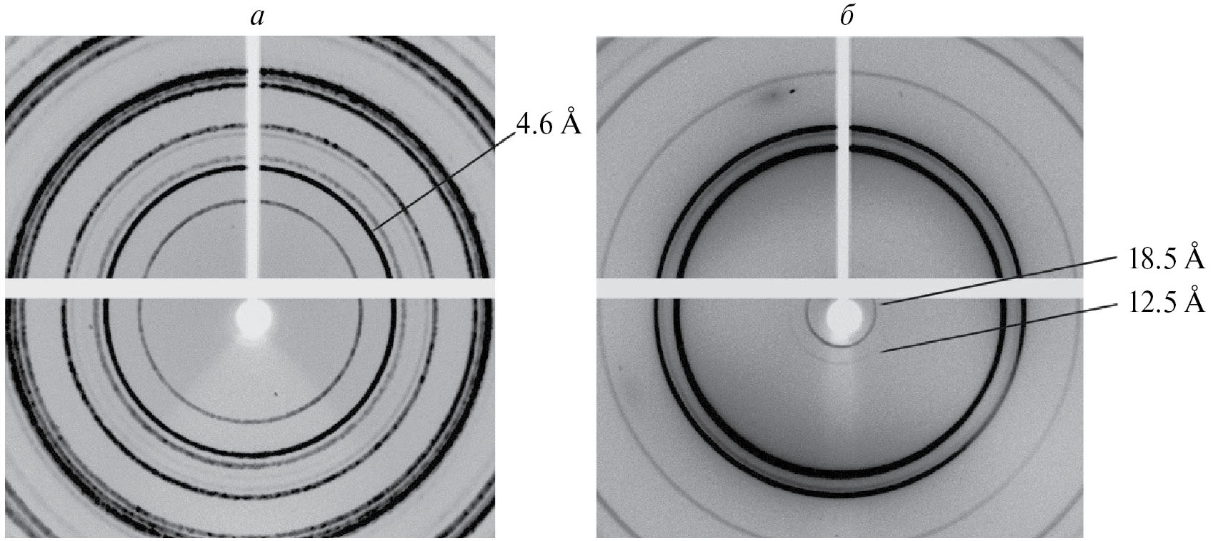 Рис. 4. Рентгеновская дифракция агрегатов титина скелетных мышц кролика после 24 ч агрегации. а – Картина рентгеновской дифракции аморфных агрегатов титина, сформированных в растворе, содержащем 0.15 М глицин-КОН, рН 7.0. Обнаружены следующие рефлексы: 5.9; 4.6; 4.3; 3.8; 3.6; 3.1; 3.04; 2.97; 2.8; 2.6; 2.53; 2.43 Å. Рефлекс ~4.6 Å относится к элементу кросс-β-структуры и характеризует расстояние между полипептидными цепями; б – Картина рентгеновской дифракции аморфных агрегатов титина, сформированных в растворе, содержащем 200 мМ KCl, 10 мM имидазол, pH 7.0. Обнаружены следующие рефлексы: 18.5; 12.5; 4.1; 3.7; 2.9; 2.48 Å.