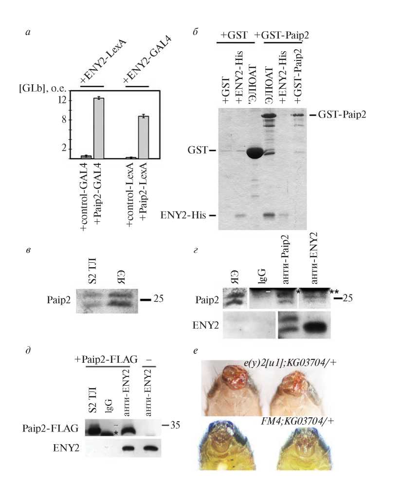 Рис. 1. Белки Paip2 и ENY2 взаимодействуют друг с другом. а – Активация репортерного гена LacZ при добавлении субстрата β-галактозидазы CPRG. Результаты представлены в виде относительных единиц активности (о. е.) β-галактозидазы [GLb] (рассчитаны как частное от деления полученных значений активности (е. а.) на общий множитель) для дрожжей, котрансформированных векторами, кодирующими ENY2-LexA и Paip2-GAL4, ENY2-LexA и control-GAL4, а также ENY2-GAL4 и Paip2-LexA, ENY2-GAL4 и control-LexA. б – Связывание аффинно очищенных рекомбинантных белков GST-Paip2 и ENY2-His6 на глутатион-сефарозе. В качестве отрицательного контроля использован белок GST. в – Анализ специфичности антител. Иммуноблотинг белков тотального лизата S2-клеток (S2 ТЛ) и ядерного экстракта (ЯЭ) из эмбрионов D. melanogaster с использованием антител кролика к Paip2. г – Анализ взаимодействия Paip2 с ENY2. Иммуноблотинг белков, осажденных из тотальных лизатов S2-клеток антителами к Paip2 и ENY2, с использованием одноименных антител. Полосы, соответствующие легким цепям антител к Paip2 и ENY2, отмечены звездочками (* и ** соответственно). д – Анализ взаимодействия Paip2-FLAG и ENY2. Иммуноблотинг белков, осажденных антителами к ENY2 из лизатов S2-клеток со сверхэкспрессией Paip2-FLAG с использованием антител к FLAG-эпитопу и ENY2. е – Анализ взаимодействия Paip2 и ENY2 на генетическом уровне. Представлены фотографии абдоминальных сегментов самцов D. melanogaster с генотипом e(y)2[u1];KG03704/+ (нарушенная морфология) и контрольных самцов с генотипом FM4;KG03704/+ (нормальная морфология).
