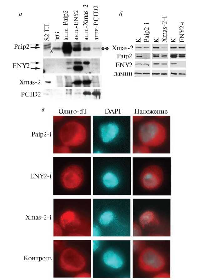 Рис. 2. Paip2 взаимодействует с белковым комплексом TREX-2. а – Иммуноблотинг белков, осажденных из лизатов S2-клеток антителами к Paip2 и к субъединицам ENY2, Xmas-2 и PCID2 комплекса TREX-2. Указаны детектируемые белки. Полосы, соответствующие сигналам от легких цепей антител, отмечены по краям блота звездочками: *слева и **справа. б – Иммуноблотинг лизатов S2-клеток с нокдауном Paip2, Xmas-2, ENY2 в результате РНК-интерференции (Paip2-i, Xmas-2-i, ENY2-i соответственно) и контрольной РНК-интерференции c дцРНК к мРНК GFP (K) с использованием антител к одноименным белкам. В качестве выравнивающего контроля использовали окрашивание антителами к ламину Dm0. в – Распределение мРНК в S2-клетках при нокдауне Paip2, ENY2, Xmas-2 в результате РНК-интерференции (Paip2-i, ENY2-i, Xmas2-i соответственно) и контрольных клетках с РНК-интерференцией с дцРНК к мРНК GFP (контроль). FISH-гибридизацию РНК S2-клеток проводили с Cy3-меченым oligo-dT-зондом. Ядра клеток окрашены DAPI.