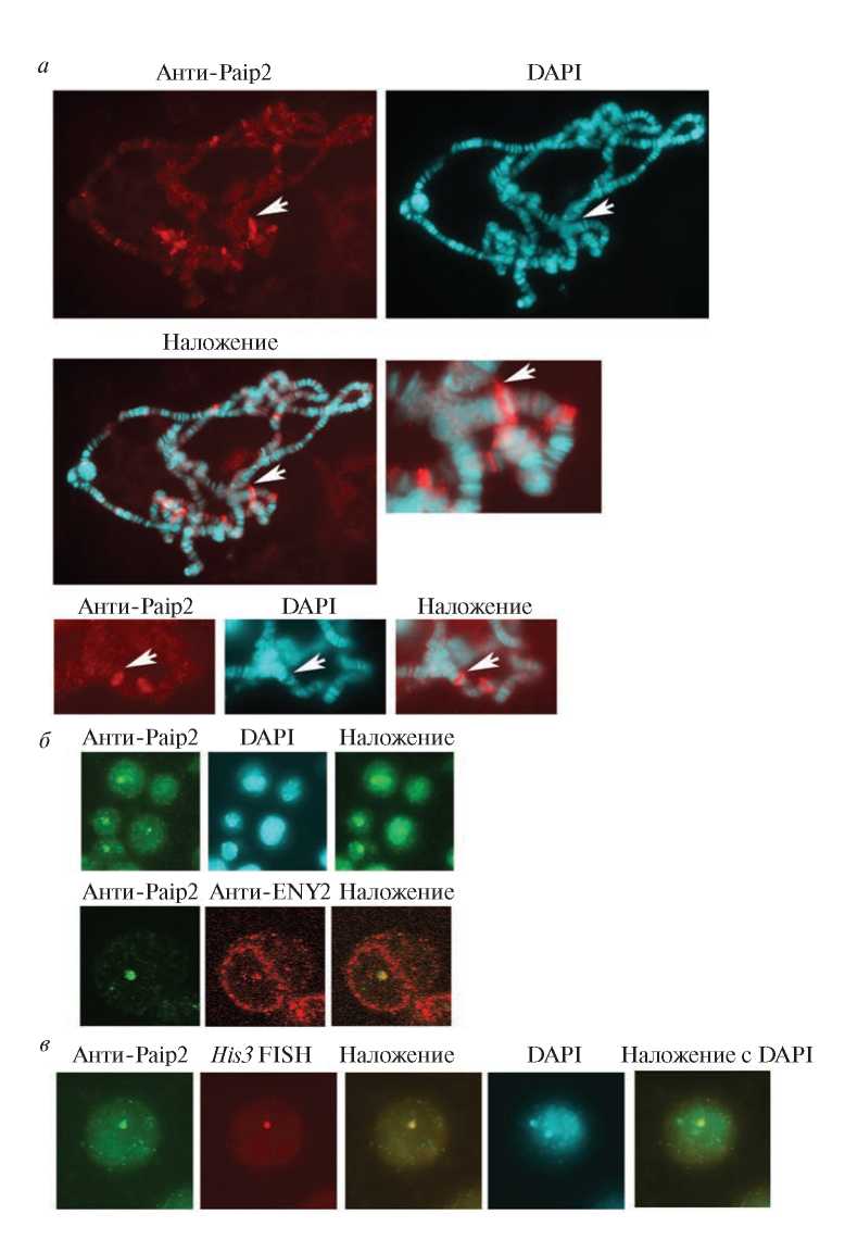 Рис. 3. Paip2 и ENY2 локализуются в локусе кластера репликативнозависимых генов гистонов. a – Иммуноокрашивание политенных хромосом из ядер слюнных желез личинок D. melanogaster с использованием антител к Paip2. Для окрашивания ДНК использовали DAPI. Локус кластера репликативнозависимых генов гистонов указан стрелкой. Приведено увеличенное изображение окрашенного локуса. б – Иммуноокрашивание S2-клеток с использованием в качестве первичных мышиных антител к Paip2 и кроличьих антител к ENY2. Ядра клеток окрашены DAPI. в – FISH-гибридизация S2-клеток с His3-зондом, совмещенная с иммуноокрашиванием антителами к Paip2. Ядра клеток окрашены DAPI.