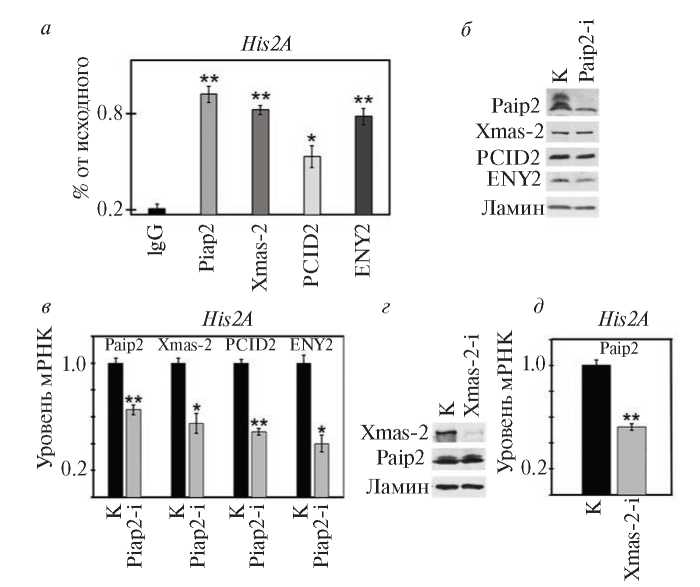 Рис. 4. Белок Paip2 ассоциирован с мРНП-частицами гистонов. а – Результаты иммунопреципитации мРНК His2A из ядерной фракции S2-клеток антителами к Paip2 и субъединицам Xmas-2, PCID2, ENY2 комплекса TREX-2. В качестве отрицательного контроля использованы IgG кролика. Результаты иммунопреципитации РНК (RIP) представлены в процентах от исходного количества. б – Иммуноблотинг лизатов S2-клеток с нокдауном Paip2 (Paip2-i), а также GFP в качестве отрицательного контроля (K). Использованы антитела к Paip2, Xmas-2, PCID2 и ENY2. В качестве внутреннего контроля использовано окрашивание антителами к ламину Dm0. в – Результаты иммунопреципитации мРНК His2A антителами к Paip2, Xmas-2, PCID2, ENY2 при нокдауне Paip2. Представлены уровни мРНК His2A, осажденной антителами из экстрактов с нокдауном Paip2 (Paip2-i), нормализованные относительно уровня мРНК His2A, осажденной из экстрактов с нокдауном GFP, принятого за единицу (K). г – Иммуноблотинг лизатов S2-клеток с нокдауном Xmas-2 (Xmas-2-i) и нокдауном GFP в качестве отрицательного контроля (К) с использованием антител к Xmas-2 и Paip2. В качестве внутреннего контроля использовано окрашивание антителами к ламину Dm0. д – Результаты иммунопреципитации мРНП-частиц гена His2A антителами к Paip2 при нокдауне Xmas-2. Представлены уровни мРНК His2A, осажденной антителами из экстрактов с нокдауном Xmas-2 (Xmas-2-i), нормализованные относительно уровня мРНК His2A, осажденной из экстрактов с нокдауном GFP, принятого за единицу (K). Все данные на графиках представлены как среднее значение ± SD; для сравнения данных контроля и эксперимента использован t-критерий Стьюдента; *p-value < 0.05, **p-value < 0.01.