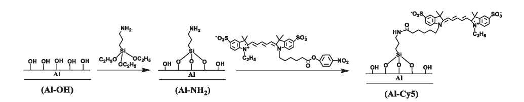 Рис. 1. Схема аминирования и флуоресцентного маркирования поверхности алюминиевой подложки.
