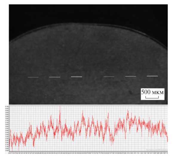 Рис. 3. Микрофотография алюминиевой подложки в свете флуоресценции красителя Cy5 при выдержке 100 мс после модификации поверхности 3-аминопропилтриэтоксисиланом (АПТЭС) и маркирования флуоресцентным красителем Cy5. Показан график распределения сигналов вдоль проведенной линии на флуоресцентном изображении.