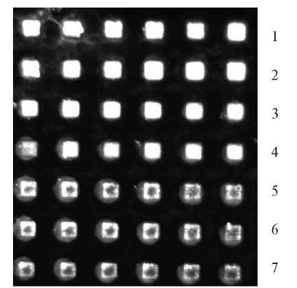 Рис. 8. Картина флуоресценции ячеек чипа на канале Cy3 с иммобилизованными ДНК-зондами при микрокапельном нанесении растворов, содержащих различные хаотропные реагенты. Выдержка 100 мс. Буфер карбонатный, рН 9.0, 5% глицерина. 1 – 10% формамида; 2 – 20% формамида; 3 – 10% DМSO; 4 – 20% DMSO; 5 – 0.01% Твин 20; 6 – 0.1% Твин 20; 7 – без добавок.