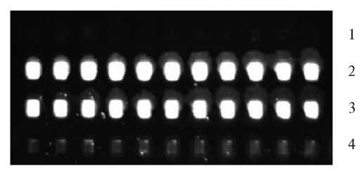 Рис. 9. Картина флуоресценции ячеек чипа на канале Cy3 с иммобилизованными ДНК-зондами при микрокапельном нанесении растворов, содержащих различные концентрации глицерина. Выдержка 100 мс. Буфер карбонатный, рН 9.0, 10% формамида. 1 – пустые ячейки; 2 – 5% глицерина; 3 – 10% глицерина; 4 – 20% глицерина.