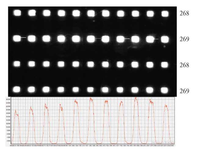 Рис. 11. Картина флуоресценции на канале Cy5 ячеек из щеточных полимеров на поверхности алюминиевой подложки после гибридизации с мишенью, маркированной красителем Cy5. Показаны графики распределения сигналов вдоль проведенной линии на флуоресцентном изображении ряда 1 зонда № 268 и ряда 2 зонда № 269.