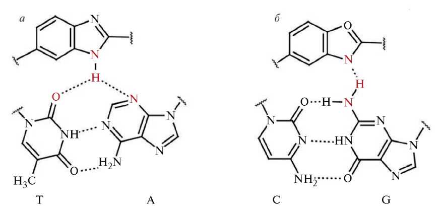 Рис. 1. Образование водородной связи между бензимидазолом и АТ-парой (а) и бензоксазолом и GC-парой ДНК (б).