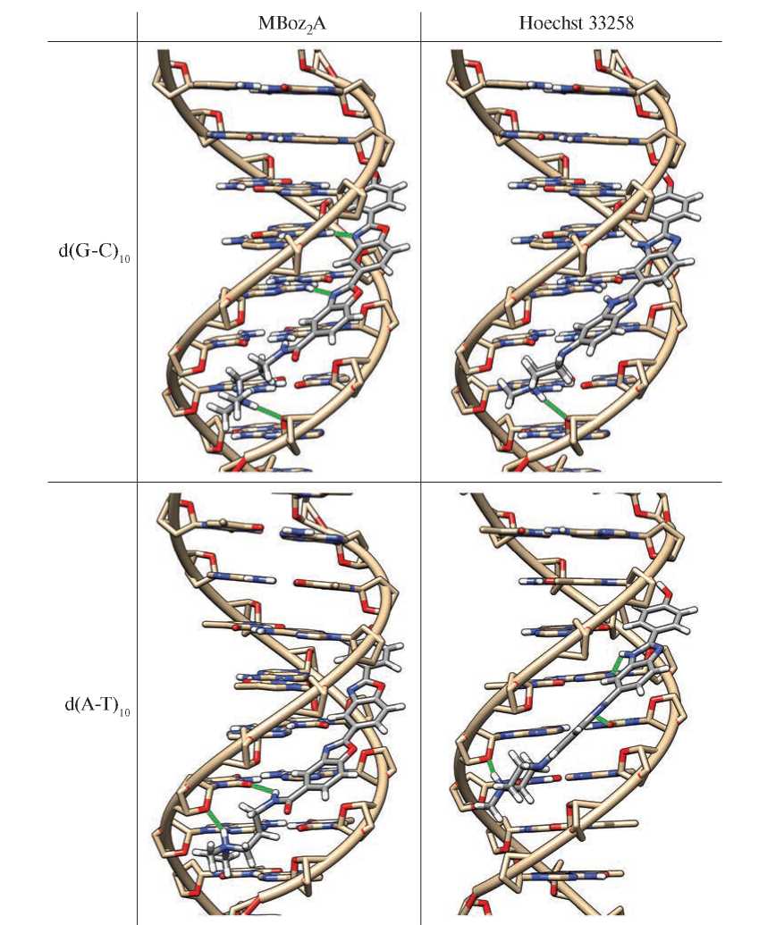 На рис. 2 представлена компьютерная модель комплексов MBoz₂A и Hoechst 33258 с d(A-T)₁₀ и d(G-C)₁₀.