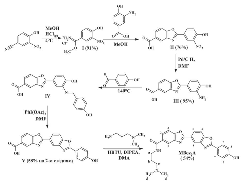 Мономерный бисбензоксазол MBoz₂A был синтезирован из 4-гидрокси-3-нитробензонитрила, превращенного в реакции Пиннера в хлоргидрат иминоэфира (I), сконденсированного затем с 3-амино-4-гидроксибензойной кислотой. Полученное нитросоединение (II) было восстановлено каталитическим гидрированием в амин (III). Конденсация амина (III) с 4-гидроксибензальдегидом привела к образованию основания Шиффа (IV), которое окислили диацетоксийодбензолом с образованием производного бисбензоксазола (V). Синтез целевого соединения MBoz₂A был завершен в результате взаимодействия (V) c N,N-диметилпропиламином в присутствии конденсирующего агента HBTU. Структура синтезированных соединений подтверждена методами 1Н-ЯМР-спектроскопии и спектрометрии MALDI-TOF. Схема синтеза MBoz₂A представлена на рис. 4.