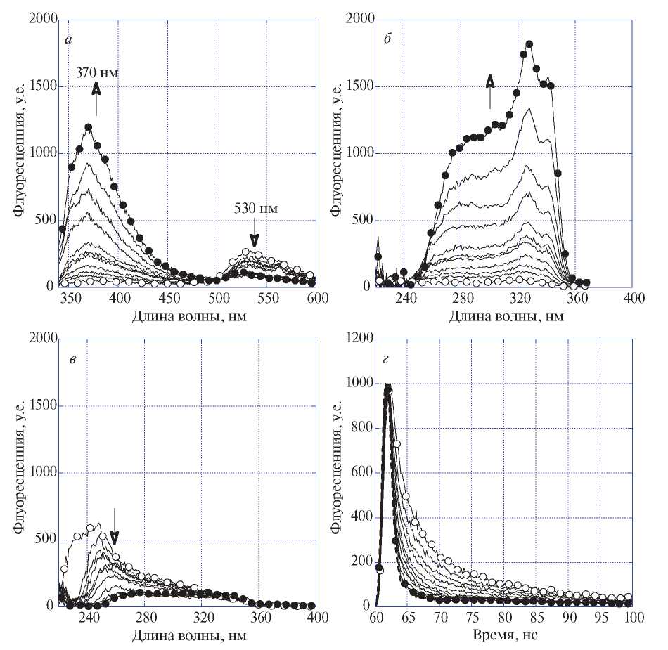 В дополнение к спектральным характеристикам мы изучили затухание флуоресценции и время жизни возбужденного состояния. При возбуждении импульсным светодиодом при 280 нм общая флуоресценция регистрировалась при длинах волн выше 305 нм (рис. 5г).