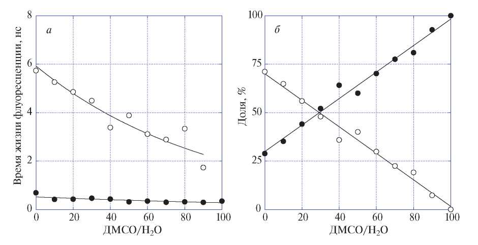 Рис. 6. Флуоресценция сольватных форм MBoz₂A в системе вода–ДМСО в зависимости от объемной доли ДМСО. а – Время жизни флуоресценции сольватных форм; б – доля вклада сольватных форм в общую флуоресценцию. Пустые кружки – сольватная форма с большим временем жизни флуоресценции (агрегат), полные кружки – сольватная форма с коротким временем жизни флуоресценции (мономер).