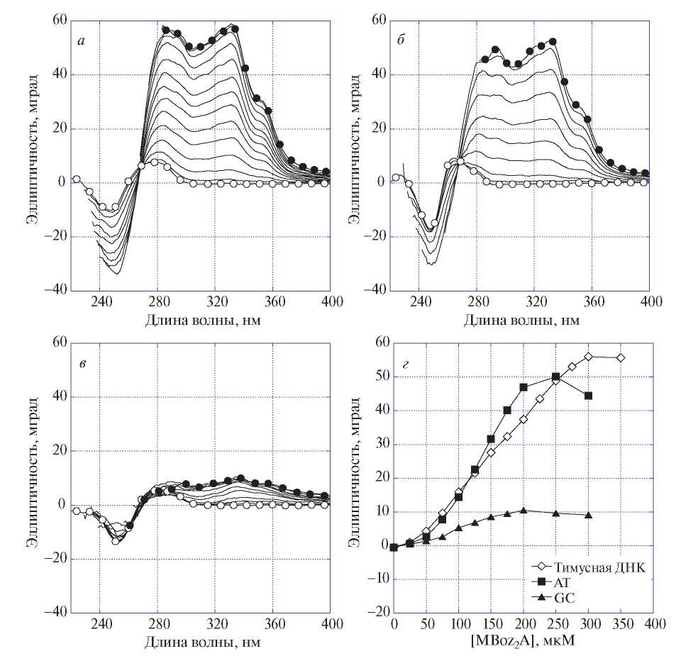 Показано, что добавление MBoz₂A к 10 мкМ раствору синтетического альтернирующего дуплекса poly(dA-dT)•poly(dA-dT) (рис. 7б) и ДНК тимуса теленка (рис. 7a) приводит к появлению положительной полосы индуцированного дихроизма, что свидетельствует о взаимодействии исследуемого вещества с ДНК и об образовании неинтеркаляционного комплекса в одной из бороздок. Однако гиперинтенсивный рост индуцированного сигнала и изменение спектра дихроизма дцДНК говорит об образовании комплексов, характеризующихся одновременной локализацией на одном участке бороздки двух или трех молекул лиганда [16]; по-видимому, такое связывание обусловлено гидрофобными взаимодействиями.