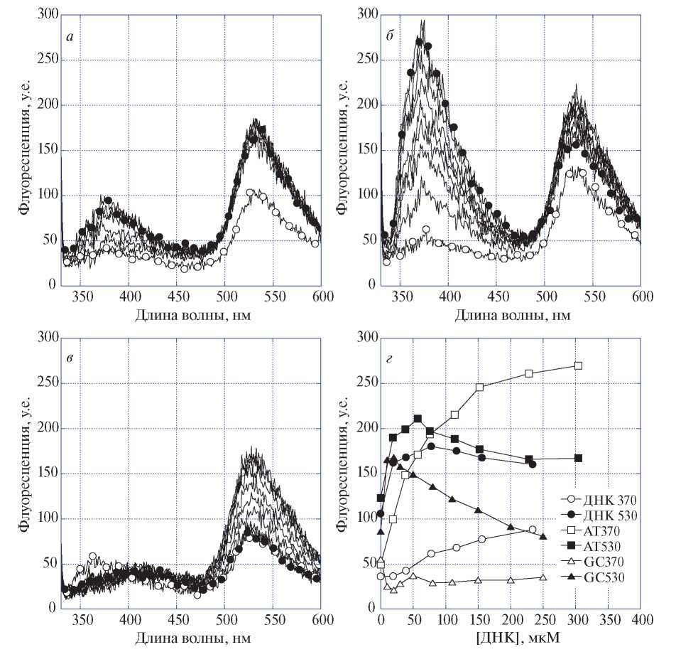 Рис. 8. Спектры флуоресценции MBoz₂A при образовании комплекса с ДНК различного нуклеотидного состава. ДНК тимуса теленка (а); poly(dA-dT)•poly(dA-dT) (б); poly(dG-dC)•poly(dG-dC) (в). Пустые кружки – MBoz₂A в отсутствие ДНК, полные кружки – максимальная концентрация ДНК в растворе лиганда. Зависимость интенсивности флуоресценции MBoz₂A от концентрации ДНК (г). Пустые символы – флуоресценция на длине волны 370 нм; заполненные символы – флуоресценция при 530 нм; кружки – ДНК тимуса теленка; квадраты – poly (dA-dT)•poly (dA-dT); треугольники – poly(dG-dC)•poly(dG-dC); [MBoz₂A] 10 мкМ в 10 мМ Na-фосфатном буфере pH 7.0, 25°C.