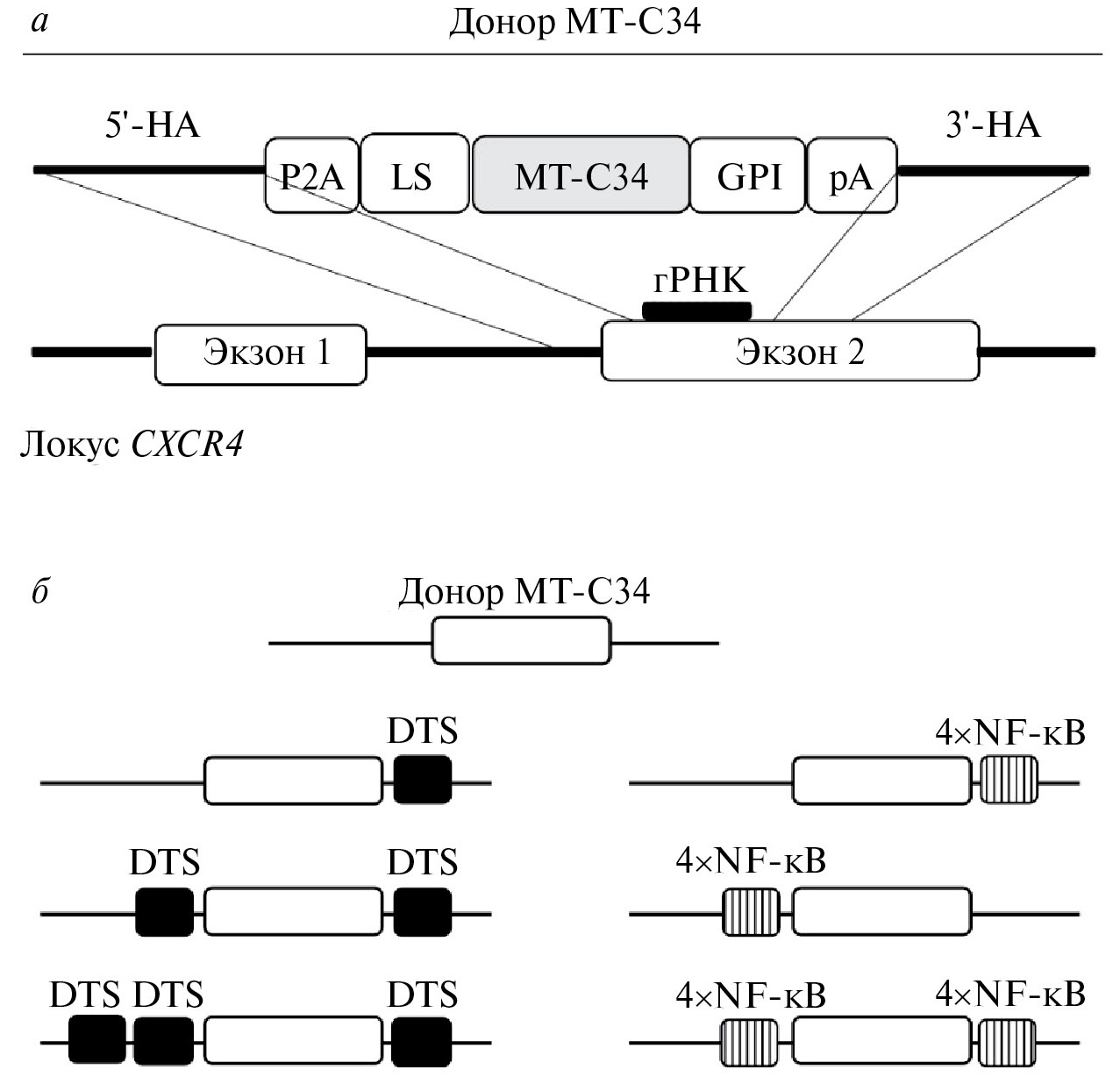 Рис. 1. Дизайн конструкции для нокина MTC34 в экзон-2 гена CXCR4 (а) и схемы донорных конструкций с различными модификациями (б). 5'-HA – 5'-плечо гомологии; Р2А – сигнал пропуска рибосомы; LS – лидерная последовательность; GPI – последовательность для модификации пептида GPI-якорем; рА – сигнал полиаденилирования; 3'-HA – 3'-плечо гомологии; гРНК – РНК-гид; DTS – ДНК-транспортирующая последовательность; 4×NF-κB – 4 сайта связывания NF-κB, разделенные короткими линкерами.
