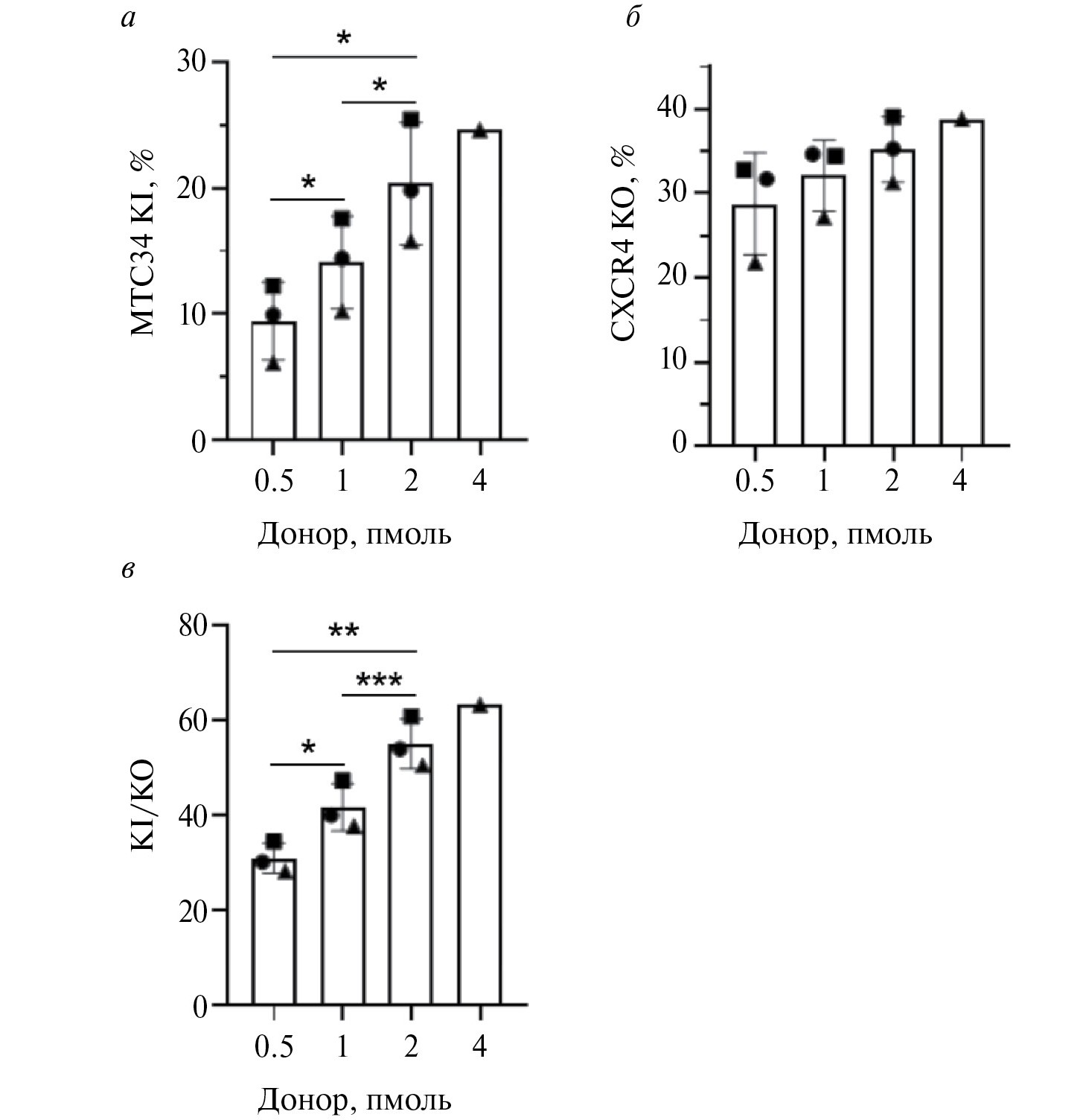 Рис. 2. Уровень нокина MTC34 (а), нокаута CXCR4 (б) и соотношение нокин/нокаут (в) в клетках CEM/R5 при различном количестве донорной ДНК. Клетки электропорировали плазмидами pcDNA3.3-hCas9, pKS-gRNA-X4ex2 и донорной плазмидой pKS-don_MT-C34 и на 5 сутки после электропорации оценивали уровень нокаута CXCR4 и нокина MTC34 на поверхности клеток с помощью проточной цитофлуориметрии. KI/KO – соотношение нокина к нокауту. Результаты 3 независимых экспериментов представлены как среднее ± стандартное отклонение (SD) и индивидуальные значения; значками разной формы обозначены независимые эксперименты. *p < 0.05, **p < 0.01, ***p < 0.001.