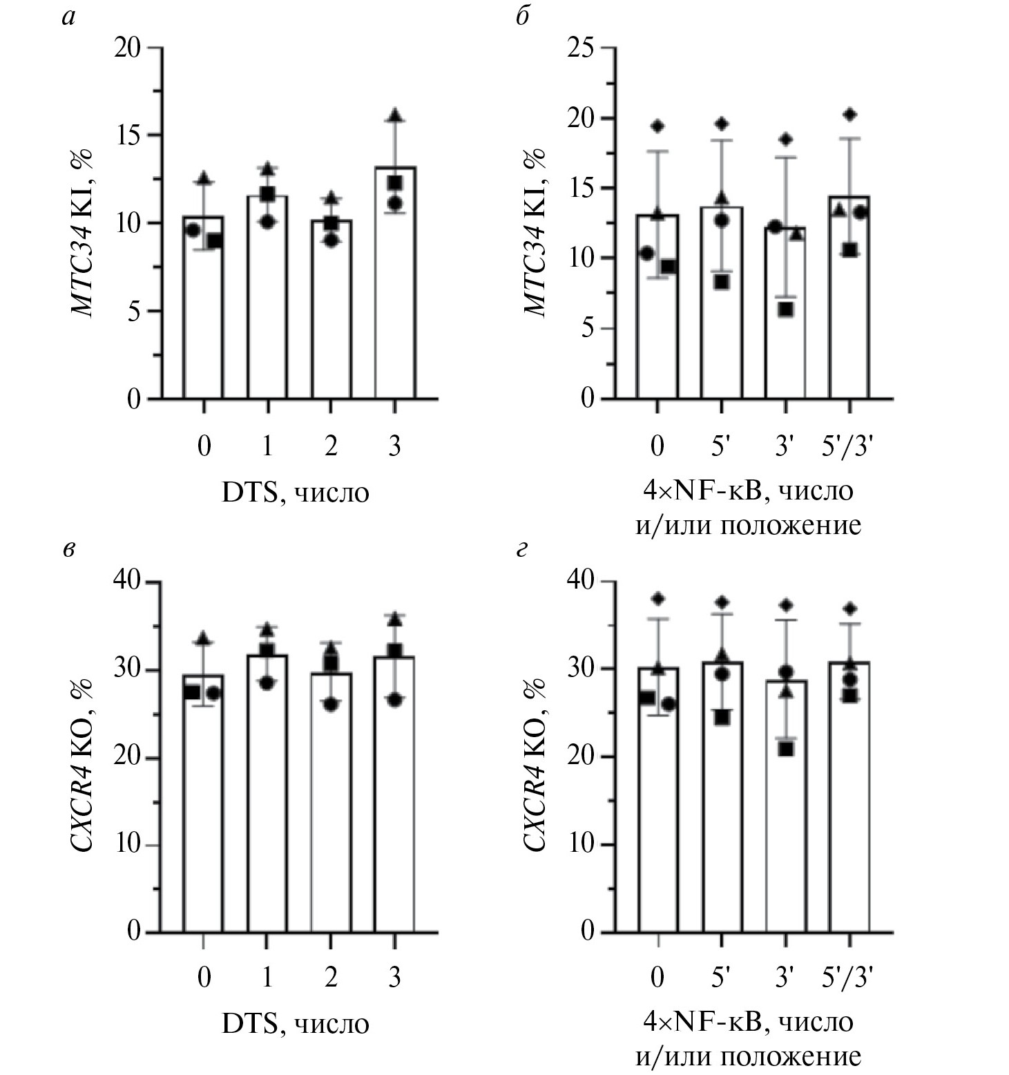 Рис. 3. Влияние DTS-сигналов в плазмидном доноре на уровень нокина. Уровень нокина MTC34 (а, б) и нокаута CXCR4 (в, г) в клетках CEM/R5. Клетки электропорировали плазмидами pcDNA3.3-hCas9, pKS-gRNA-X4ex2 и 1 пмоль донорной плазмиды pKS-don_MT-C34 без модификаций, с различным числом сигналов DTS (а, в) или различным числом и/или положением сайтов связывания NF-κB (б, г). На 5 сутки после электропорации оценивали уровень нокаута CXCR4 и нокина MTC34 на поверхности клеток с помощью проточной цитофлуориметрии. Результаты 3‒4 независимых экспериментов представлены как среднее ± SD и индивидуальные значения; значками разной формы обозначены независимые эксперименты. *p < 0.05, **p < 0.01.