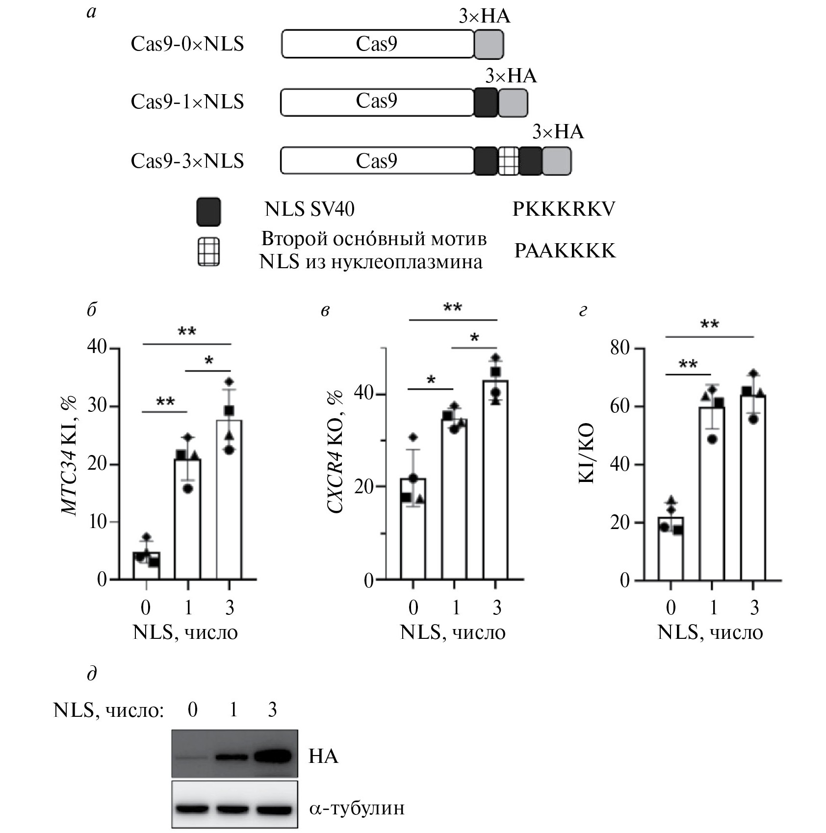 Рис. 4. Влияние числа NLS в белке Cas9 на эффективность редактирования локуса CXCR4. а – Схемы конструкций на основе плазмиды pcDNA3.3-hCas9. Приведены аминокислотные последовательности NLS SV40 и последовательность второго оснóвного мотива из NLS нуклеоплазмина. Уровень нокина МТС34 (б), нокаута CXCR4 (в) и соотношение нокин/нокаут (г) в клетках CEM/R5, электропорированных одной из конструкций 1‒3 (а) вместе с плазмидами pKS-gRNA-X4ex2 и pKS-don_MT-C34. Уровень нокаута CXCR4 и нокина MTC34 оценивали методом проточной цитофлуориметрии на 5 сутки после электропорации. KI/KO – соотношение нокина к нокауту. Результаты 4 независимых экспериментов представлены как среднее ± SD и индивидуальные значения; значками разной формы обозначены независимые эксперименты. *p < 0.05, **p < 0.01. д – Анализ методом иммуноблотинга экспрессии белка Cas9 с разным числом NLS (0, 1 и 3) в клетках CEM/R5. Лизаты окрашивали антителами к HA-эпитопу (для детекции Cas9) и к α-тубулину (для контроля уровня общего белка в лизатах).