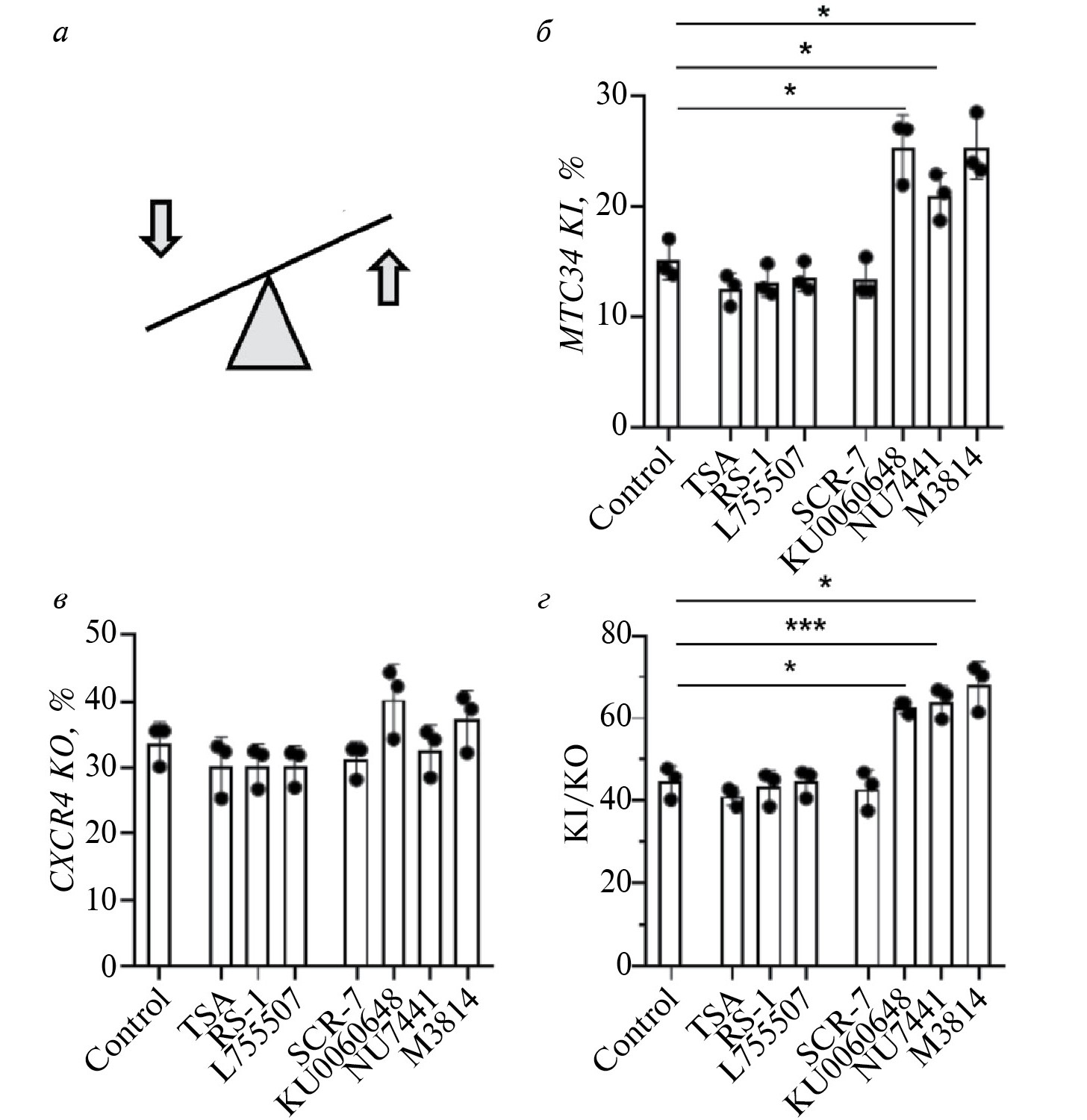 Рис. 5. Повышение уровня нокина за счет ингибирования механизма NHEJ и стимуляции HDR. а – Низкомолекулярные соединения, использованные в работе. Уровень нокина МТС34 (б), нокаута CXCR4 (в) и соотношение нокин/нокаут (г) в клетках CEM/R5. Клетки электропорировали плазмидами pcDNA3.3-hCas9, pKS-gRNA-X4ex2 и pKS-don_MT-C34, через 24 ч среду меняли на свежую, еще через 72 ч оценивали уровень нокаута CXCR4 и нокина MTC34 методом проточной цитофлуориметрии. KI/KO – соотношение нокина к нокауту. Результаты 3 независимых экспериментов приведены как среднее ± SD и индивидуальные значения; значками разной формы обозначены независимые эксперименты. *p < 0.05, ***p < 0.001.