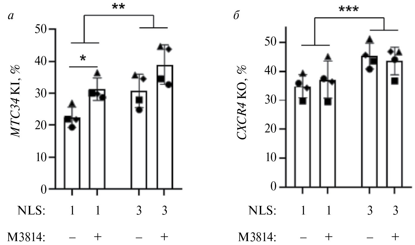 После электропорации клетки в течение 24 ч культивировали в среде с DMSO или M3814, переводили в свежую среду и на 5 сутки после электропорации анализировали уровень CXCR4 и MT-C34 на поверхности клеток с помощью проточной цитофлуориметрии. В образцах с Cas9-3×NLS по сравнению с образцами Cas9-1×NLS уровень нокаута был выше в среднем на 20%, а уровень нокина – на 30% (рис. 6а, б). При введении в среду соединения М3814 уровень нокина повышался на 30%, а уровень нокаута при этом не изменялся. При совместном использовании обоих подходов наблюдался аддитивный эффект, при котором уровень нокина возрастал на 70% по сравнению с контрольным образцом.
