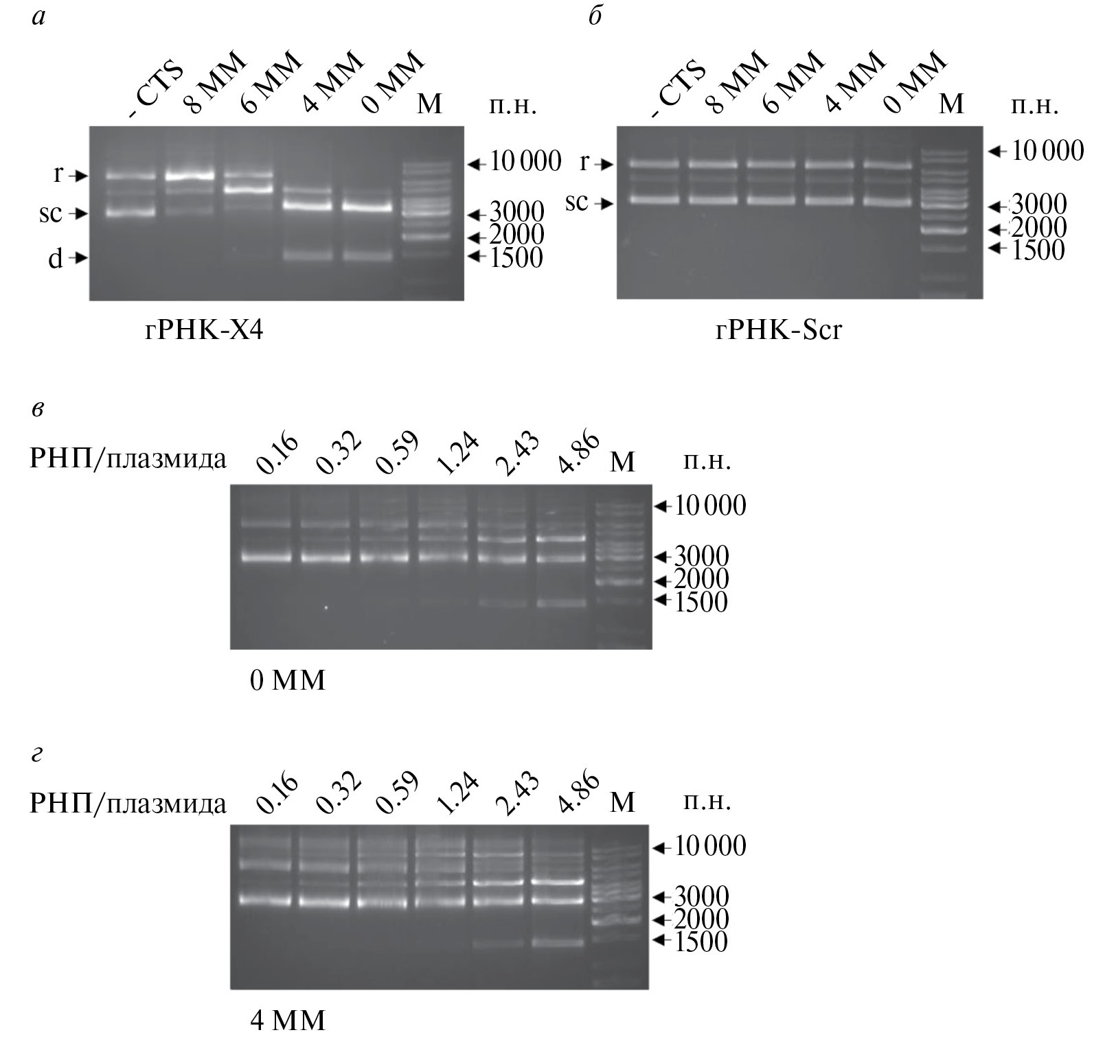 Рис. 3. Расщепление CTS-сайтов под действием Cas9 in vitro. Донорные плазмиды с CTS-сайтами, содержащими 0, 4, 6 или 8 некомплементарных оснований, а также донорную плазмиду без модификаций (‒CTS) инкубировали in vitro с комплексом Cas9 и гРНК против CXCR4 (гРНК-X4) (а) или контрольной (гРНК-Scr) (б) и оценивали уровень расщепления плазмиды с помощью электрофореза в 1%-ном ТАЕ-агарозном геле. Условные обозначения: r (relaxed) – релаксированная форма плазмиды, sc (super-coiled) – суперскрученная форма, d – фрагмент ~1 400 п. н. с донорной последовательностью, фланкированный CTS- или tCTS-сайтами. Донорные плазмиды с CTS-сайтами, содержащими 0 (в) или 4 (г) некомплементарных оснований, инкубировали in vitro с возрастающим количеством РНП и оценивали уровень расщепления плазмиды с помощью электрофореза в 1%-ном ТАЕ-агарозном геле. РНП/плазмида – молярное соотношение РНП к плазмидной ДНК. М – маркеры длины ДНК: 10 000, 8 000, 6 000, 5 000, 4 000, 3 500, 3 000, 2 500, 2 000, 1 500, 1 000, 750 п. н. (#SM1163; “Thermo Fisher Scientific”, США).