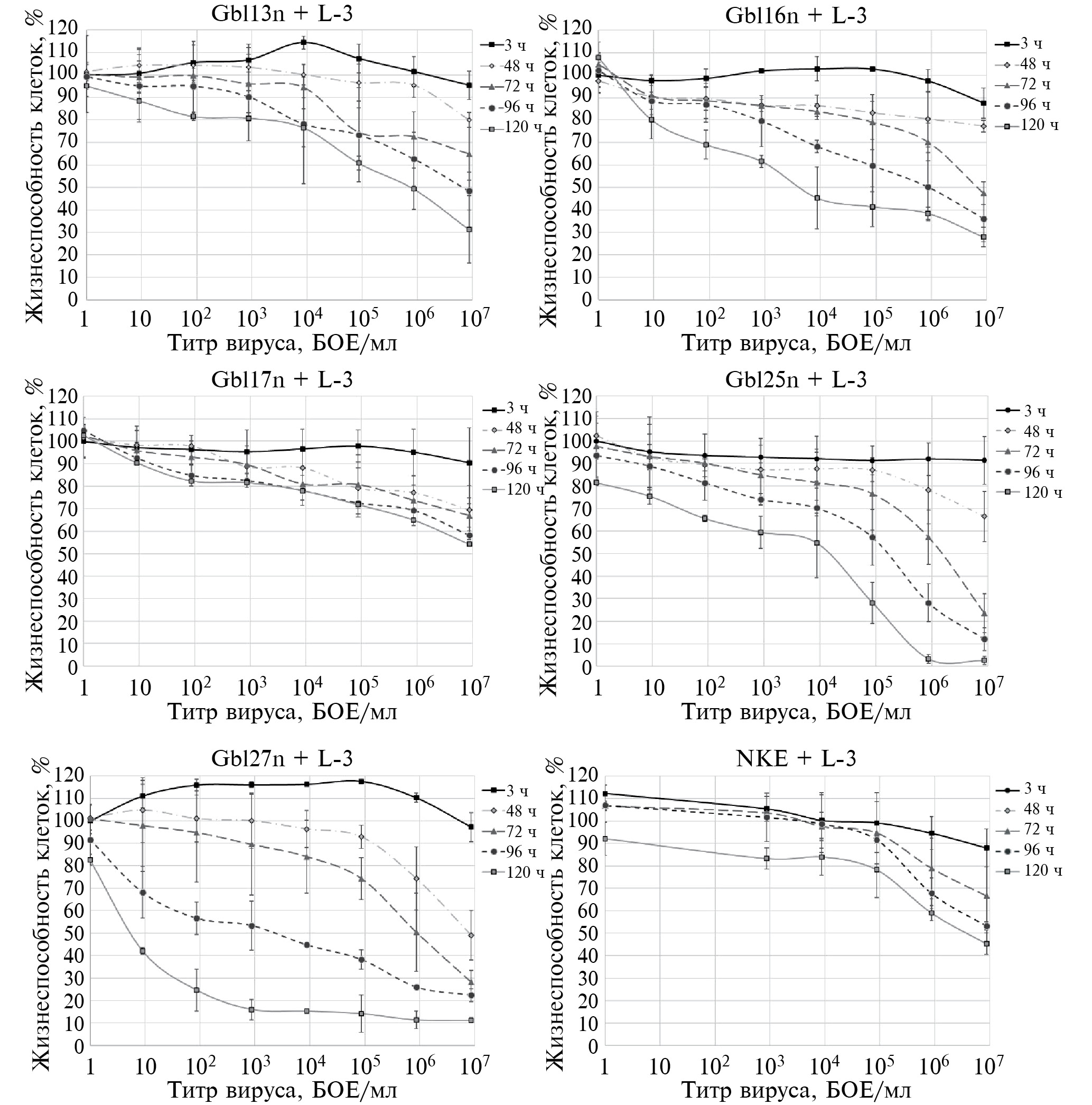 Рис. 1. Жизнеспособность пяти первичных культур клеток глиобластомы и иммортализованной культуры клеток NKE, инкубированных с вирусом паротита (MV) штамм Ленинград-3 (L-3), через 3–120 ч после заражения. По оси абсцисс отложен титр инокулированного вируса (БОЕ/мл), по оси ординат – жизнеспособность клеток (%), соответствующая значениям оптической плотности зараженной культуры клеток, выраженным в процентах от значений в незараженной культуре непосредственно перед заражением (0 ч), принятым за 100%. Значение “0” по оси абсцисс соответствует УФ-инактивированному MV. Полосы погрешностей обозначают стандартное отклонение.