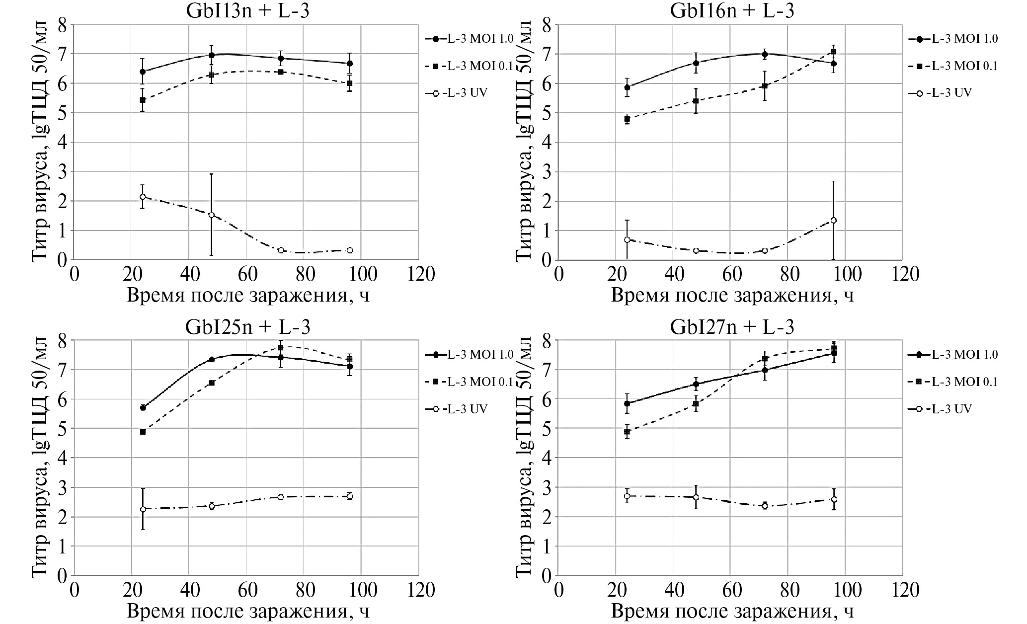Рис. 3. Титры вируса паротита (MV) штамм Ленинград-3 (L-3), рассчитанные по накоплению вирусной РНК в клетках глиобластомы Gbl13n, Gbl16n, Gbl25n и Gbl27n. MV собирали с клеток глиобластомы, зараженных с MOI 0.1 (–◙-) либо 1.0 (–●-) или зараженных УФ-инактивированным MV в качестве контроля. В каждой постановке реакции параллельно определяли пороговые циклы для разведений стандартного образца MV с известным титром вируса, по результатам которых строили калибровочную кривую. На нее наносили значения пороговых циклов исследуемых образцов и рассчитывали значения, выраженные в lgТЦД50/мл, которые условно принимали за титры [16].