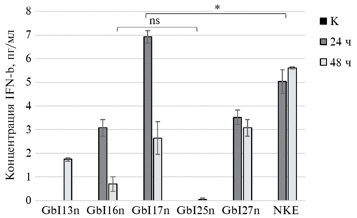 Рис. 4. Продукция IFN-β MV-зараженными клетками глиобластомы. Клетки глиобластомы заражали MV с MOI 1.0, через 24 и 48 ч измеряли концентрацию IFN-β с помощью ИФА. К –незараженные культуры клеток. Полосы погрешностей обозначают стандартное отклонение. *р = 0.0244, ns: p = 0.0961.