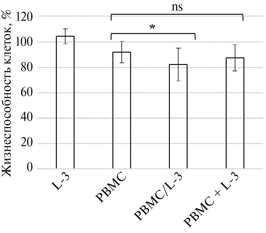 Рис. 5. Жизнеспособность клеток глиобластомы Gbl13n через 9–12 ч после инокуляции вирусом паротита (MV) штамм Ленинград-3 (L-3); инкубации с мононуклеарными клетками периферической крови (PBMC); PBMC, предварительно стимулированными MV (PBMC/L-3), а также нестимулированными PBMC с одновременной инокуляцией MV (PBMC+L-3). По оси ординат отложена жизнеспособность клеток (%), соответствующая значениям оптической плотности, выраженным в процентах от значений для незараженной культуры, принятых за 100%. Полосы погрешностей обозначают стандартное отклонение. *р = 0.0192, ns: р = 0.1857.