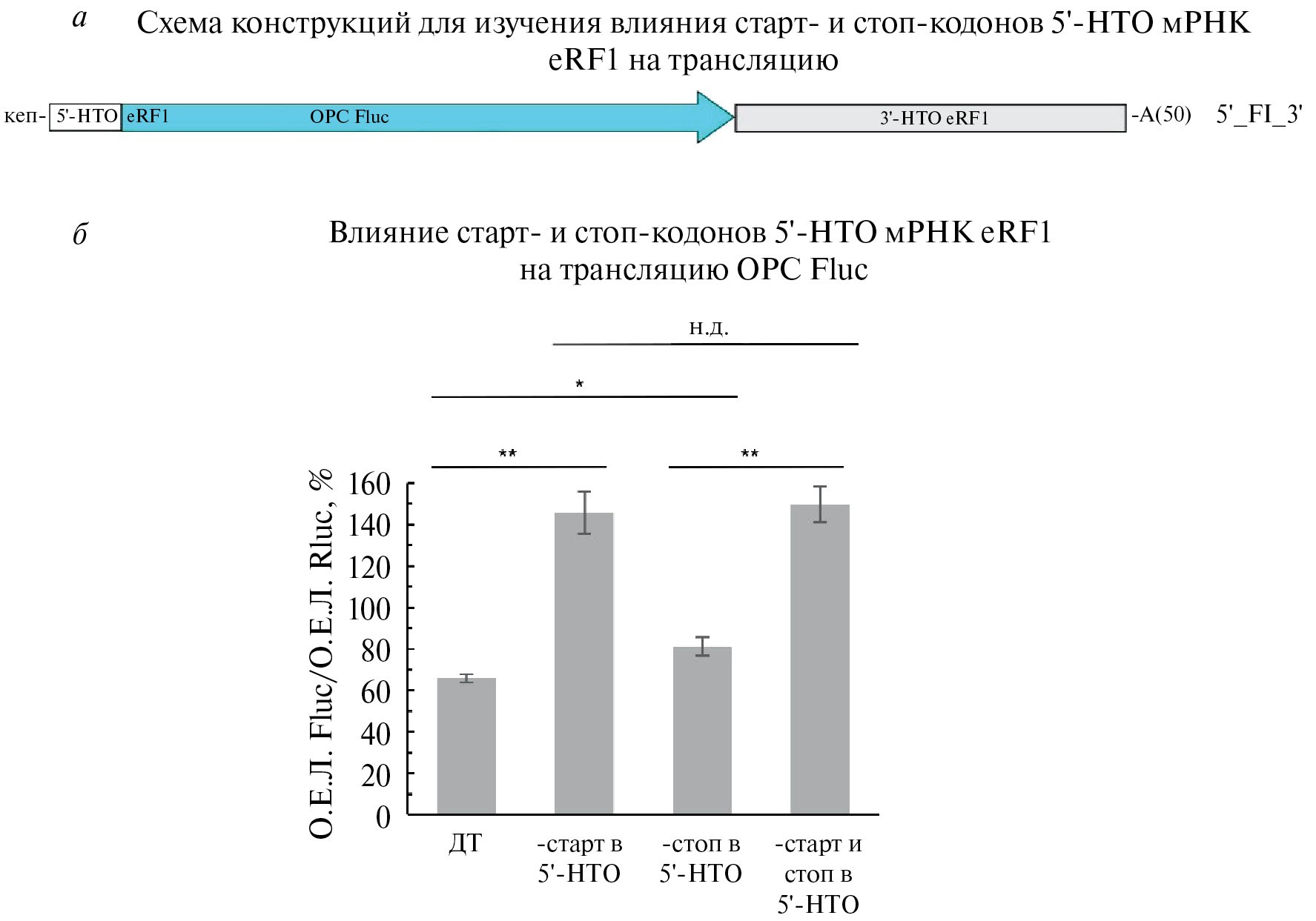 Этот же эксперимент мы повторили in vivo в клетках HEK293, трансфицировав их теми же мРНК в соответствии с методом FLERT (Fleeting mRNA Transfection technique) [38]. In vivo 5′- и 3′-НТО eRF1 совместно достоверно улучшают трансляцию репортера Fluc, в то время как одна 3′-НТО eRF1 не влияет заметно на трансляцию (рис. 3в). Таким образом, 5′-НТО eRF1 сильнее всего влияет на трансляцию фактора терминации, тогда как эффект 3′-НТО eRF1 зависит от наличия 5′-НТО eRF1.