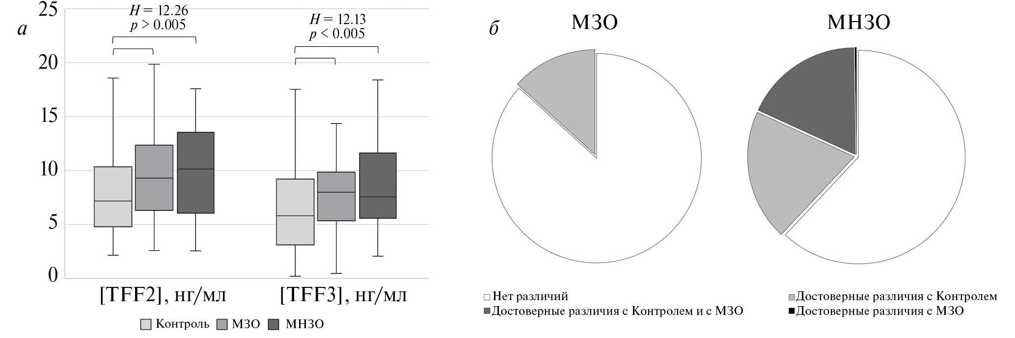 Рис. 1. Анализ концентрации трефоиловых факторов в сыворотке крови (а) и метаболического профиля кишечной микробиоты (б) у пациентов с МЗО и МНЗО. Здесь и далее: H ‒ значение Н-критерия Краскела‒Уоллиса, p ‒ уровень значимости Н-критерия Краскела‒Уоллиса. Горизонтальные планки показывают различия между группами, выявленные с использованием апостериорного теста по методу Conover (p < 0.05).