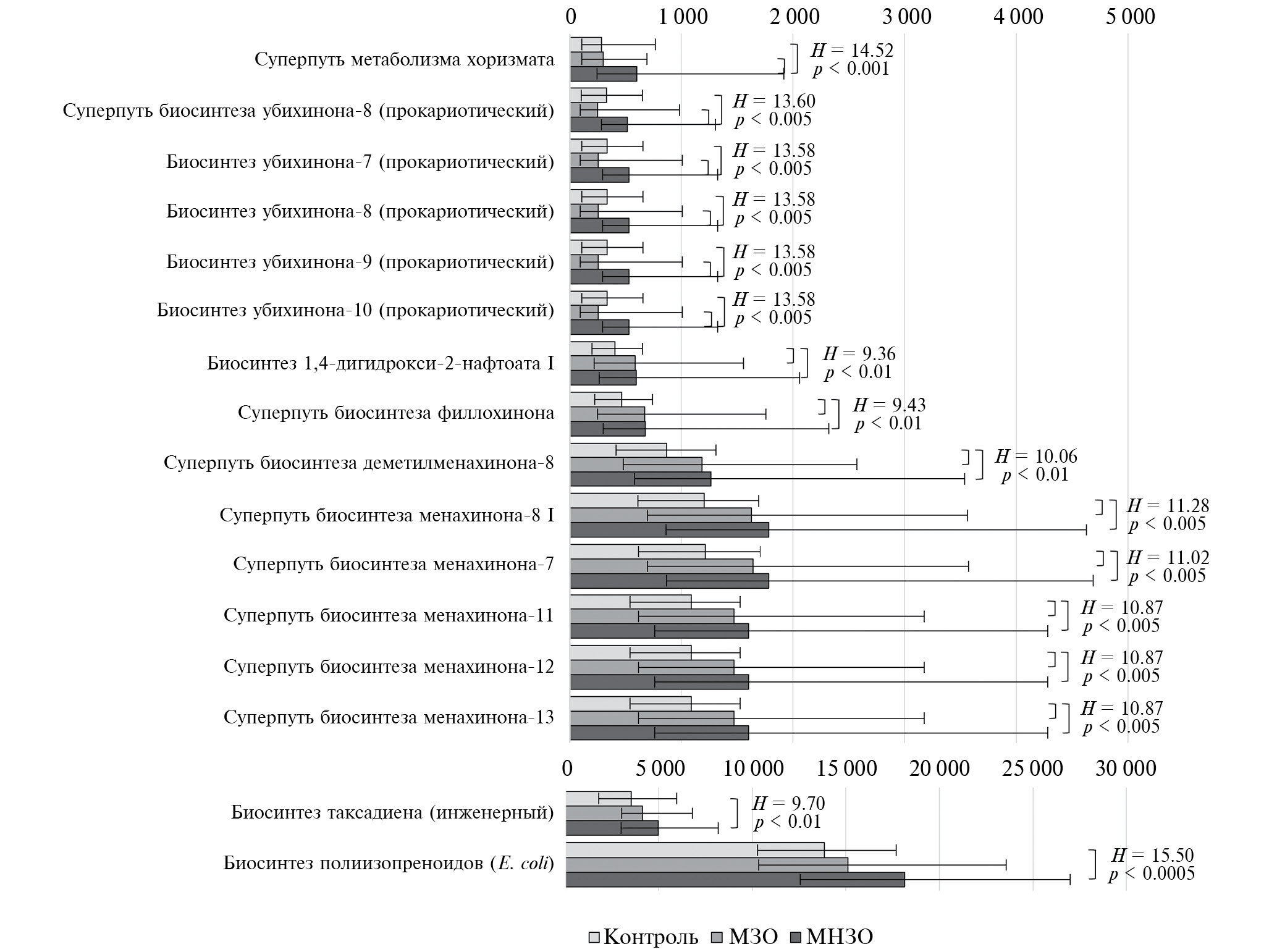 Рис. 4. Анализ путей биосинтеза терпенов и хинонов в метаболических профилях микробиома пациентов с МЗО и МНЗО.