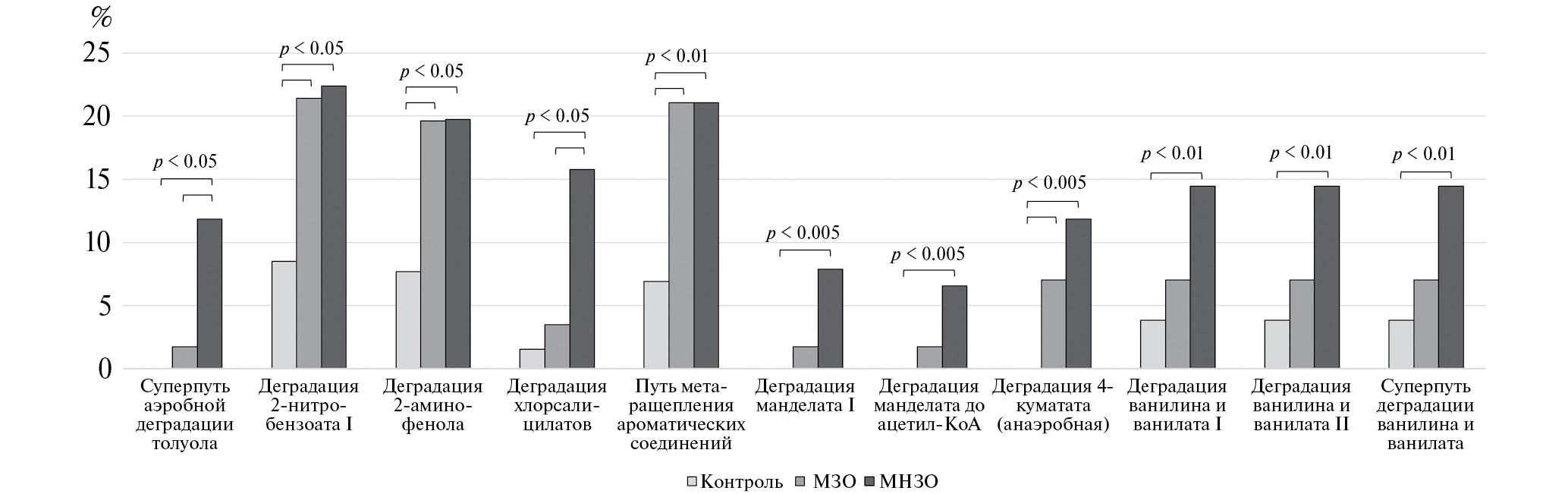 Рис. 9. Анализ распространенности путей деградации ароматических соединений в метаболических профилях микробиома пациентов с МЗО и МНЗО.