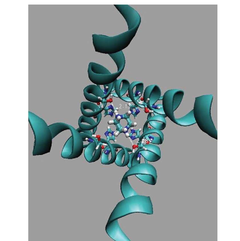 Оптимальная мода связывания, блокирующая М2-канал, приведена на рис. 3. Эти данные показывают, что оптимальная молекула-блокатор DABCOB имеет высокую энергию связывания внутри М2-канала с образованием двух сильных водородных связей (рис. 3) остатками SER31A(С) либо HIE37A(D). Связывание вне канала М2 может происходить с вероятностью ~ 0.32.