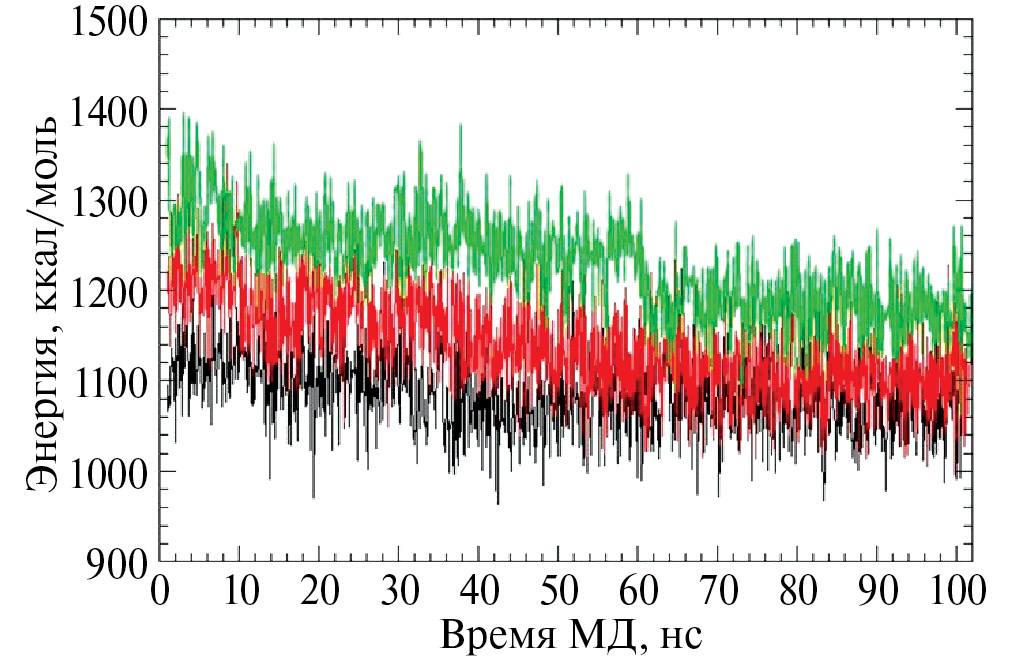 Рис. 4. Флуктуации потенциальной энергии нативной и мутантных структур Е-канала при T= 308K, pH 6.5; черный — нативная структура, красный — mut1, зеленый – mut2.