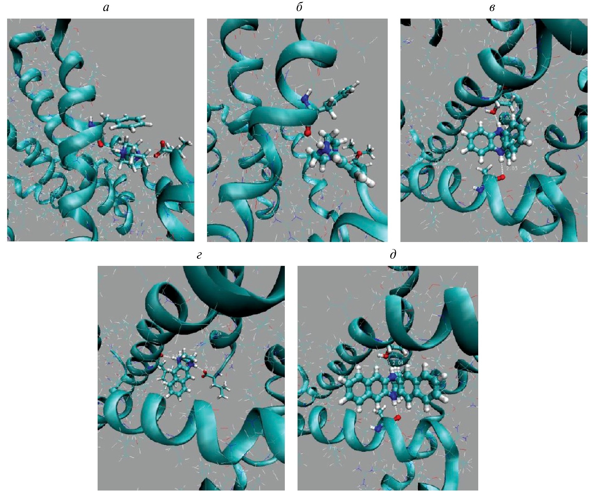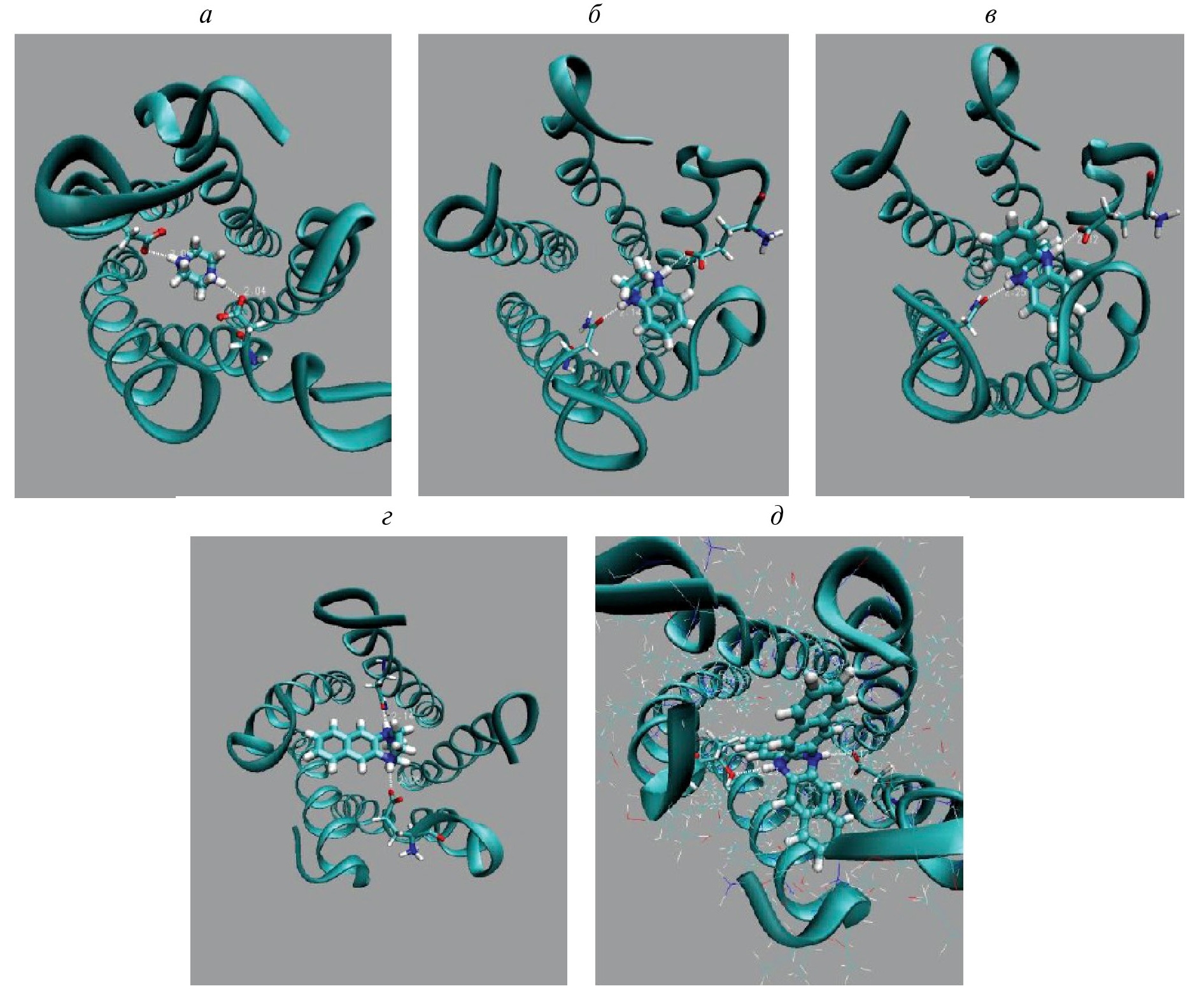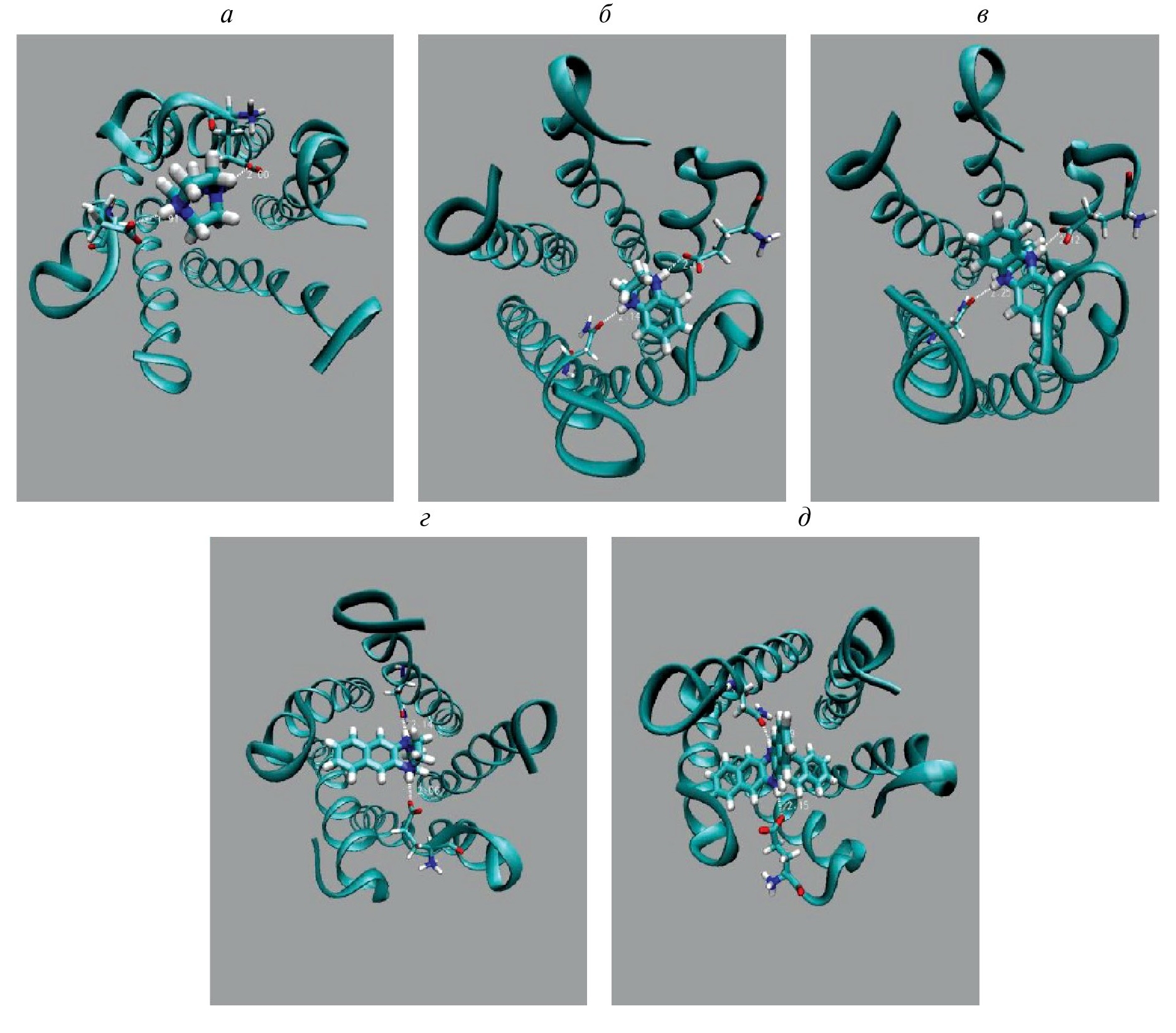 Рис. 5. Структура наивероятных, с наибольшей энергией связи, комплексов нативного Е-канала с оптимально связанными молекулами блокаторов: DABCO (а); DABCOB (б); DABCO3B (в); DABCON (г); DABCO3N (д).