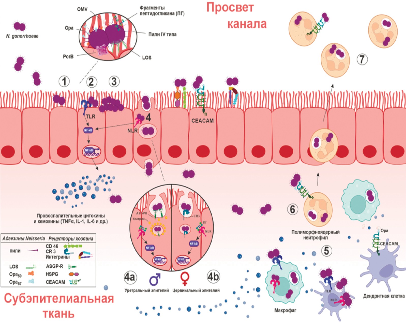 Рис. 1. Патогенез инфекции N. gonorrhoeae. Цифрами обозначены следующие стадии: 1 – прикрепление бактерий из просвета цервикального/уретрального канала к эпителию хозяина, инициируемое пилями IV типа; 2 – связавшиеся с поверхностью клеток гонококки активируют Toll-подобные рецепторы, вызывая экспрессию цитокинов через путь NF-κB; 3 – колонизация, формирование микроколоний и биопленок; 4 – эндоцитоз, инвазия и внутриклеточная персистенция гонококков, активация NOD-подобных рецепторов; 4а – взаимодействие N. gonorrhoeae с уретральным эпителием, связывание LOS с рецептором ASPG-R, клатрин-зависимая интернализация; 4b – взаимодействие N. gonorrhoeae с цервикальным эпителием, связывание пилей с рецептором CR3, клатрин-независимая интернализация; 5 – фагоцитоз N. gonorrhoeae макрофагами и дендритными клетками, привлеченными градиентами цитокинов; 6 – персистенция бактерий в макрофагах и нейтрофилах; 7 – эффлюкс нейтрофилов способствует распространению N. gonorrhoeae в составе гнойного экссудата.