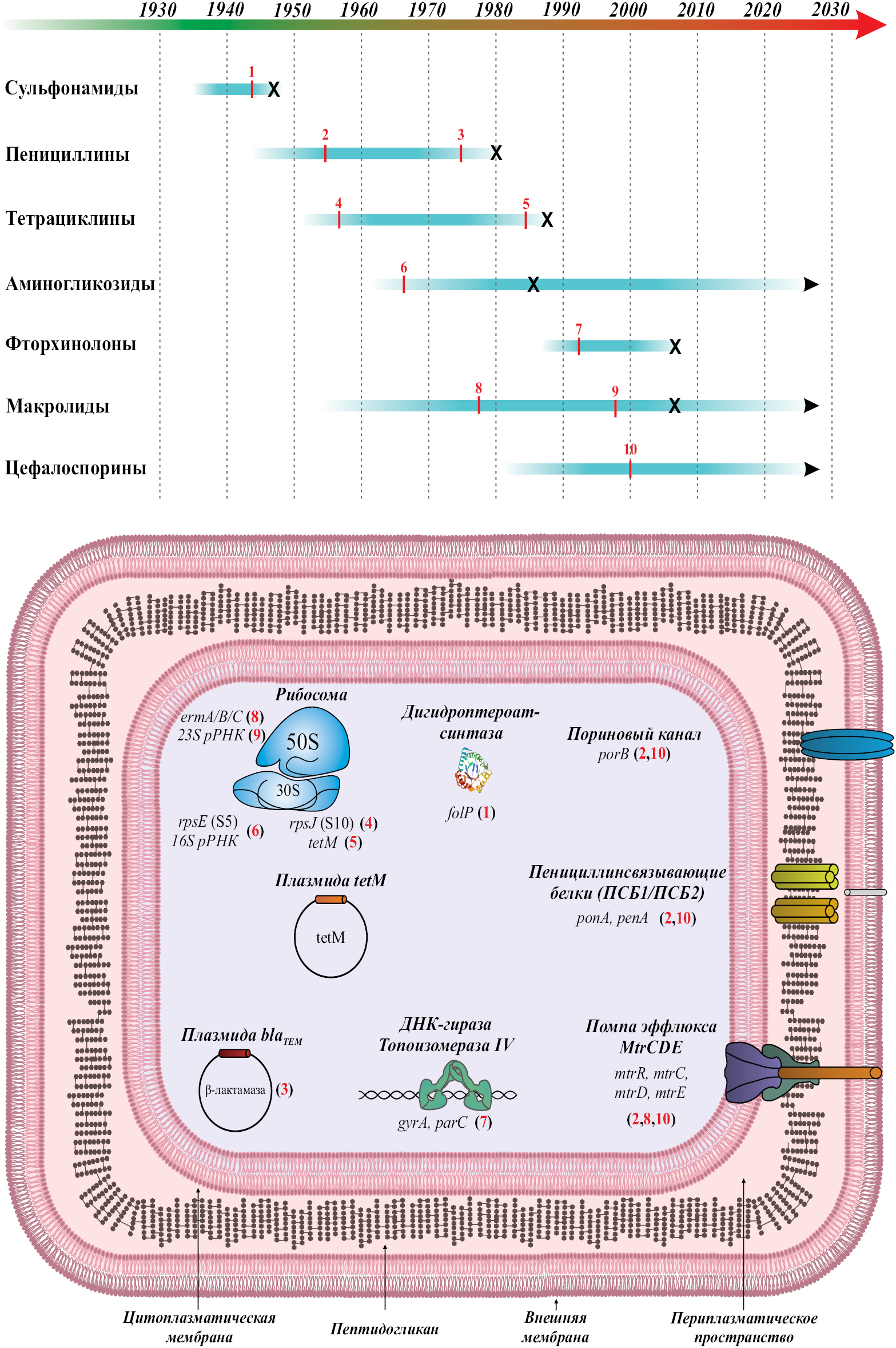 Рис. 2. История внедрения антимикробных препаратов в схемы терапии гонококковой инфекции и схематичное изображение клетки с основными мишенями действия антибиотиков и генетических детерминант устойчивости к ним. В верхней части рисунка изображена временная шкала основных рекомендованых классов антимикробных препаратов для терапии гонореи, символом (Х) отмечен приблизительный год исключения препарата из протокола лечения. Красными линиями и цифрами на шкале выделена приблизительная дата обнаружения в клинической практике первых устойчивых изолятов. Нижняя часть рисунка – белки, рРНК, гены, вовлеченные в механизмы формирования устойчивости к антимикробным препаратам. Красные цифры соответствуют мишеням применяемых антибиотиков.