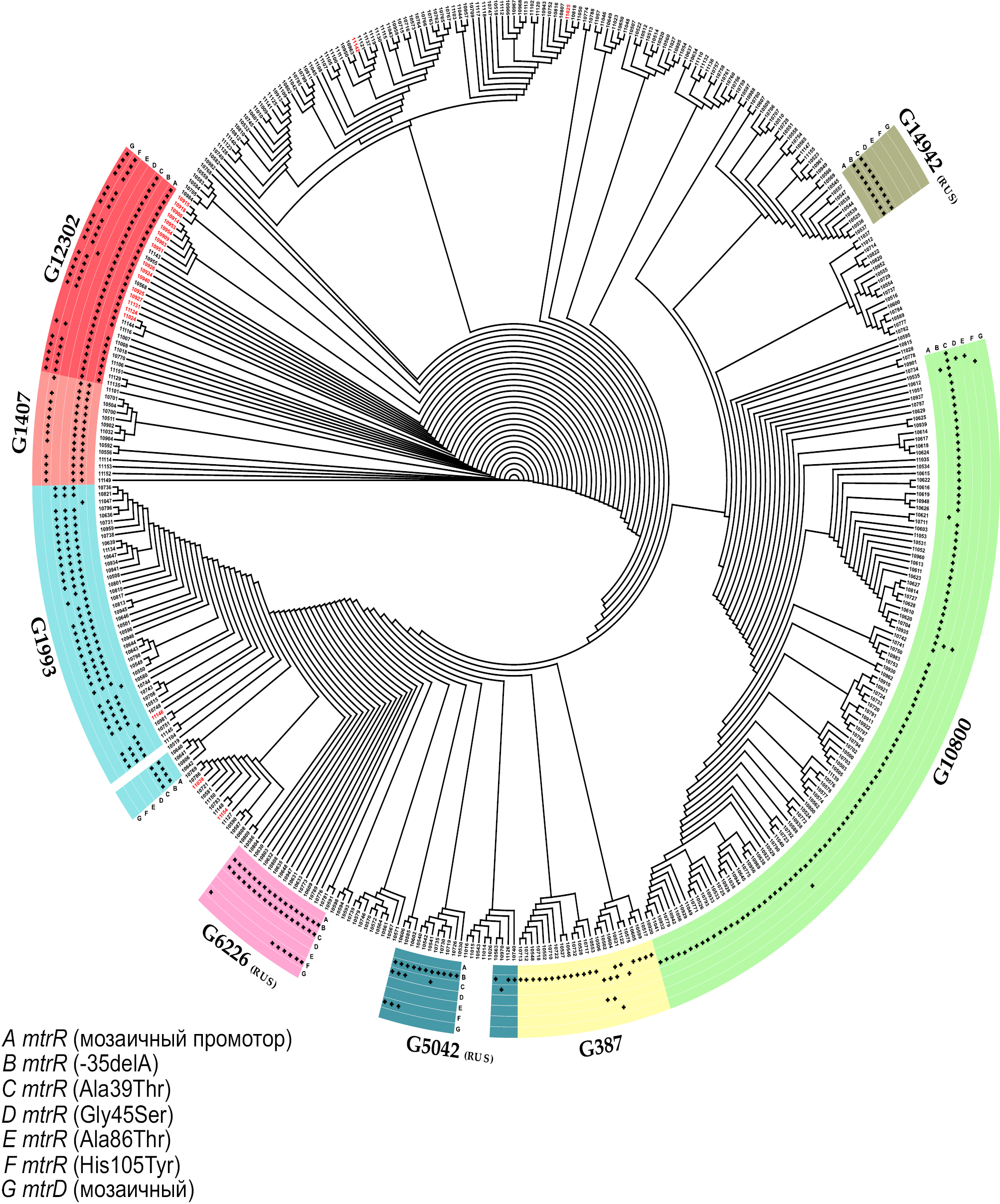 мутации в гене mtrR: “delA” в положении –35 в промоторной области, инсерция нуклеотидов insTT/instT в положении –10, мутации в кодирующей области | |
