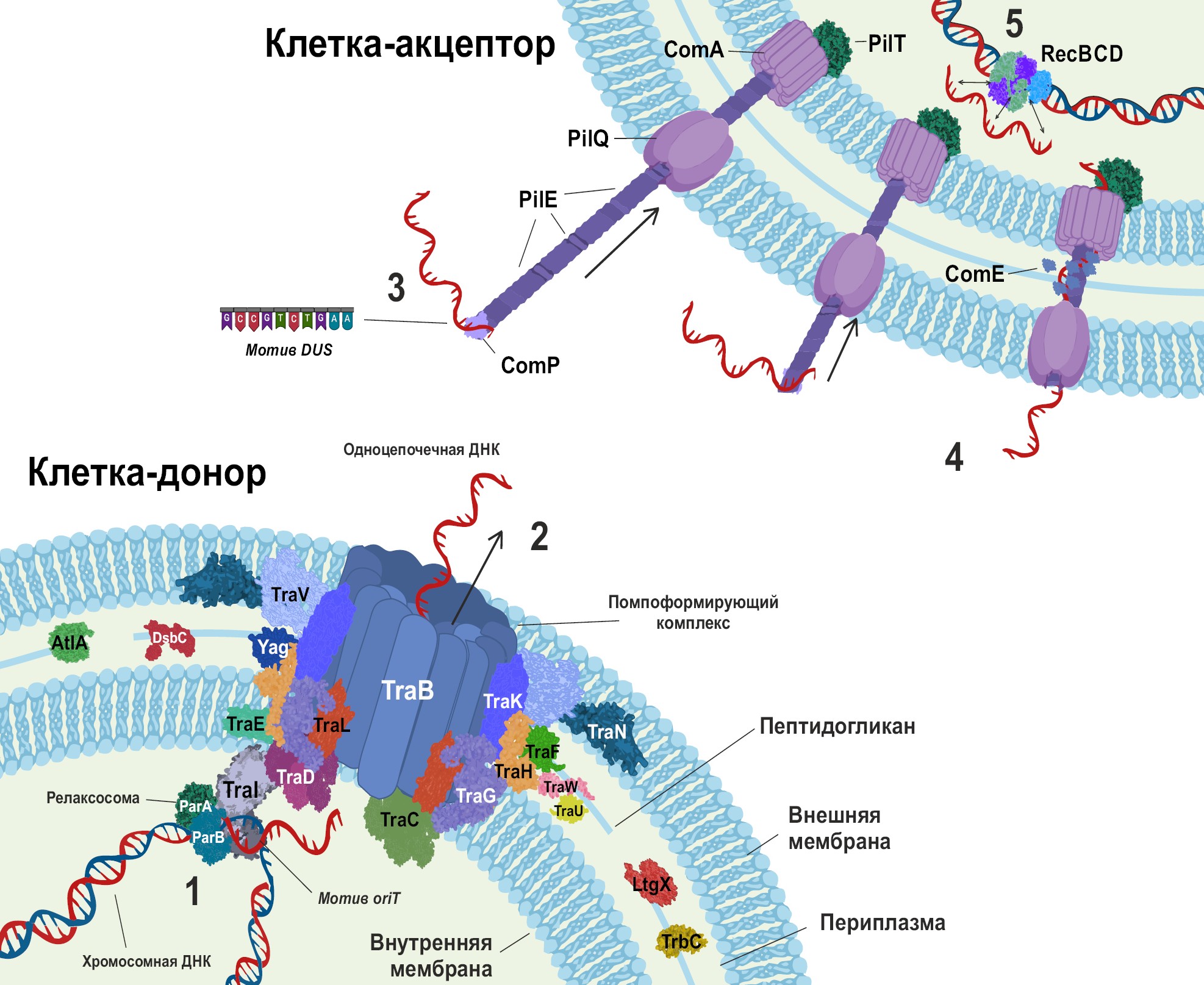 Хромосома N. gonorrhoeae состоит из 2.2 млн. п. н. В состав внехромосомных элементов входит криптоплазмида размером 4.2 т. п. н., возможно присутствие плазмиды pblaTEM (7.5 т. п. н.) и конъюгативной плазмиды (42 т. п. н.). Клетка гонококка содержит в среднем три генетически идентичных копии хромосомы [6, 7]. Благодаря естественной компетентности во всех фазах роста, N. gonorrhoeae осуществляет интенсивный горизонтальный транспорт генов (ГТГ), в том числе ассоциированных с патогенезом и устойчивостью к антимикробным препаратам [8–10]. Значительная доля изолятов N. gonorrhoeae имеет гонококковый генетический остров (GGI), кодирующий систему секреции IV типа (T4SS), способную выбрасывать оцДНК во внеклеточную среду. Эта ДНК участвует в ГТГ и вносит вклад в формирование биопленок в качестве структурного компонента на начальных этапах инфекции [11]. Для гонококков и других микроорганизмов рода Neisseria, не имеющих GGI, передача ДНК может осуществляться с помощью везикул внешней мембраны (OMV), а также посредством автолиза, хотя и с меньшей эффективностью [12]. Механизмы горизонтального переноса являются основным фактором быстрого формирования и распространения детерминант устойчивости к антибиотикам в популяции N. gonorrhoeae, что стало проблемой для мирового здравоохранения.
