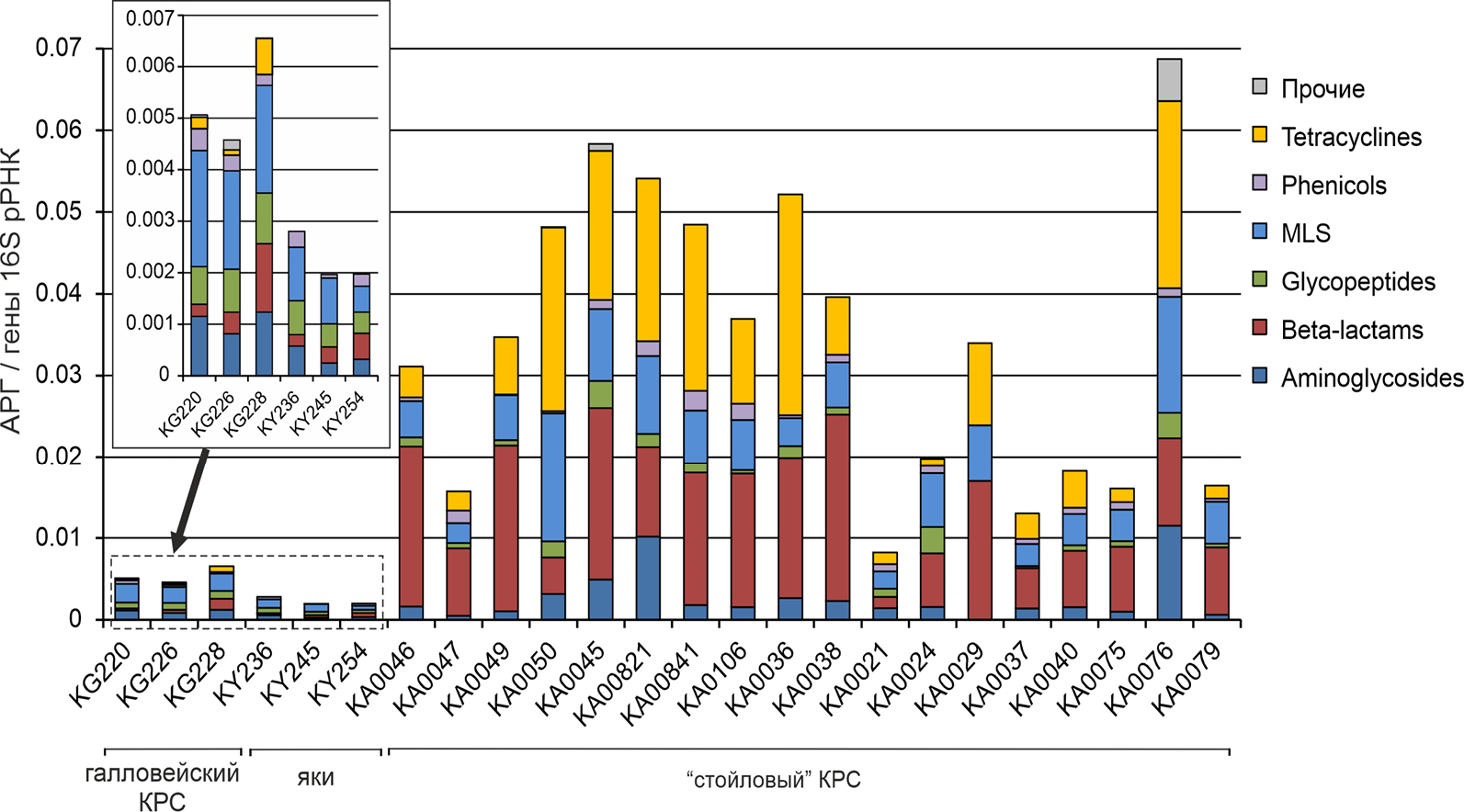 По относительному содержанию АРГ, т. е. доле резистома в полном метагеноме, исследованные животные четко разделяются на две группы в соответствии с условиями содержания, а не видовой принадлежностью: “пастбищные” (галловейская порода КРС и яки) и “стойловые”. Во всех образцах второй группы доля резистома в метагеноме (нормированная на содержание генов 16S рРНК) выше, чем у любого из пастбищных животных, а в среднем этот показатель отличался примерно на порядок. Вероятная причина этого – присутствие антибиотиков в составе кормовых добавок, применяемых на фермах. Интересно отметить, что содержание АРГ в группе “стойловых” животных сильно отличалось (рис. 3). Максимальное содержание АРГ обнаружено у молодых животных, чей возраст не превышал одного года (КА0050 и KA0076). Количество АРГ было высоким у телят (возраст до одного года), как разводимых в частных хозяйствах, так и на фермах с более высоким поголовьем в коровниках. По всей видимости, телята получают большую дозу антибиотиков через пищу ‒ в связи со специальным прикормом молоком и комбикормом.