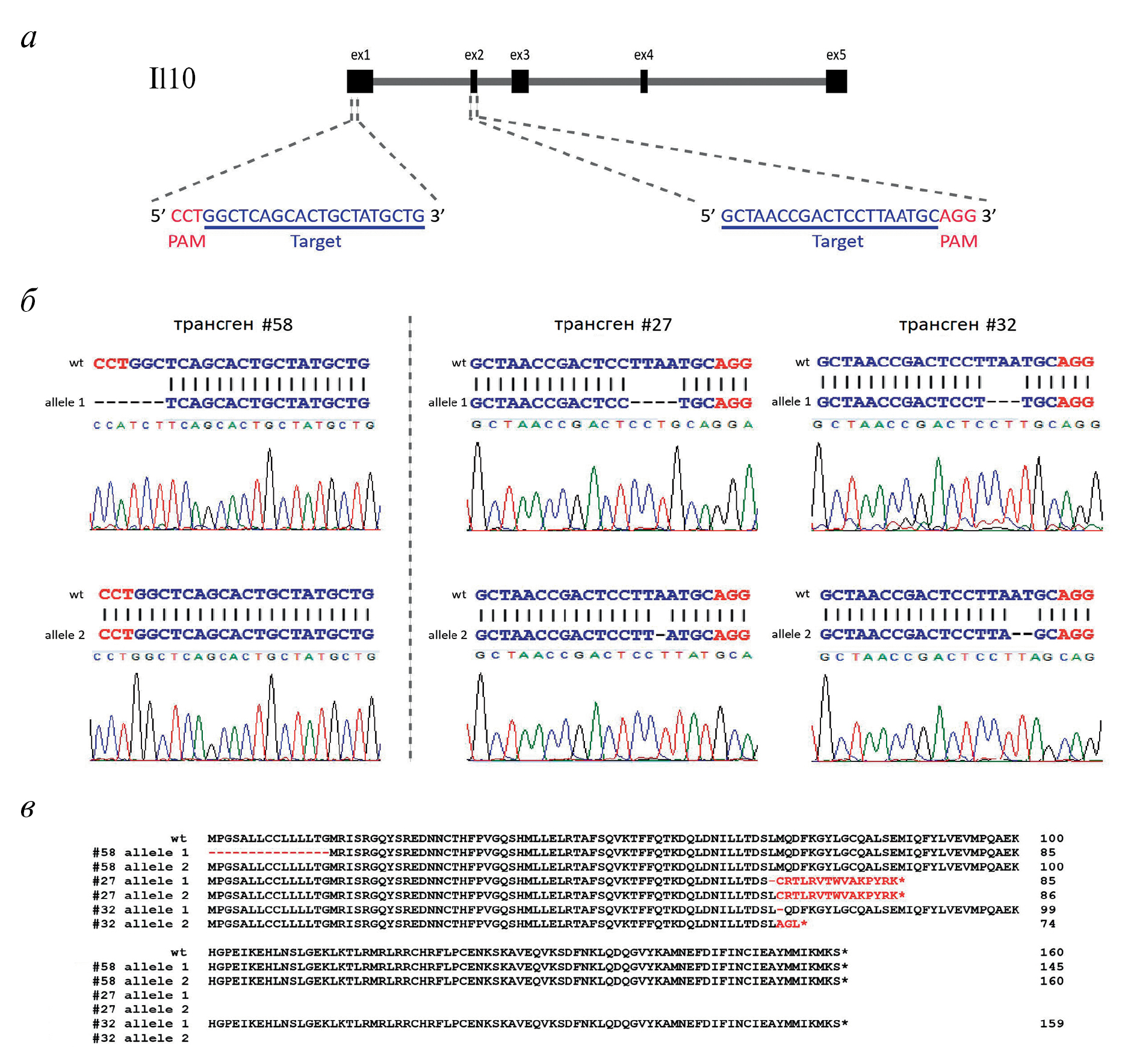 Рис. 3. Генотипирование потомства. а – Схематическая иллюстрация локуса Il10 дикого типа. Экзоны (от ex1 до ex5) и интроны обозначены черными прямоугольниками и серой линией соответственно. Две целевые последовательности (ex1 и ex2) подчеркнуты и показаны синим цветом. Последовательности мотива, примыкающего к протоспейсеру (PAM), показаны красным. б – Прямое секвенирование по Сэнгеру геномных регионов гена Il10 в потомстве F1. Трансген #58 имеет нарушения в экзоне 1, два других (#27 и #32) – в экзоне 2 гена Il10. в – Сравнение аминокислотных последовательностей гена Il10 дикого типа и потомства после i-GONAD. Контрольная аминокислотная последовательность белка Il10 дикого типа показана сверху. Аминокислотные последовательности мутированных белков Il10 (полученных из трансгенов #58, #27 и #32) показаны ниже. Прогнозируемые последствия мутации аминокислотных последовательностей выделены красным. Стоп-кодоны обозначены *.