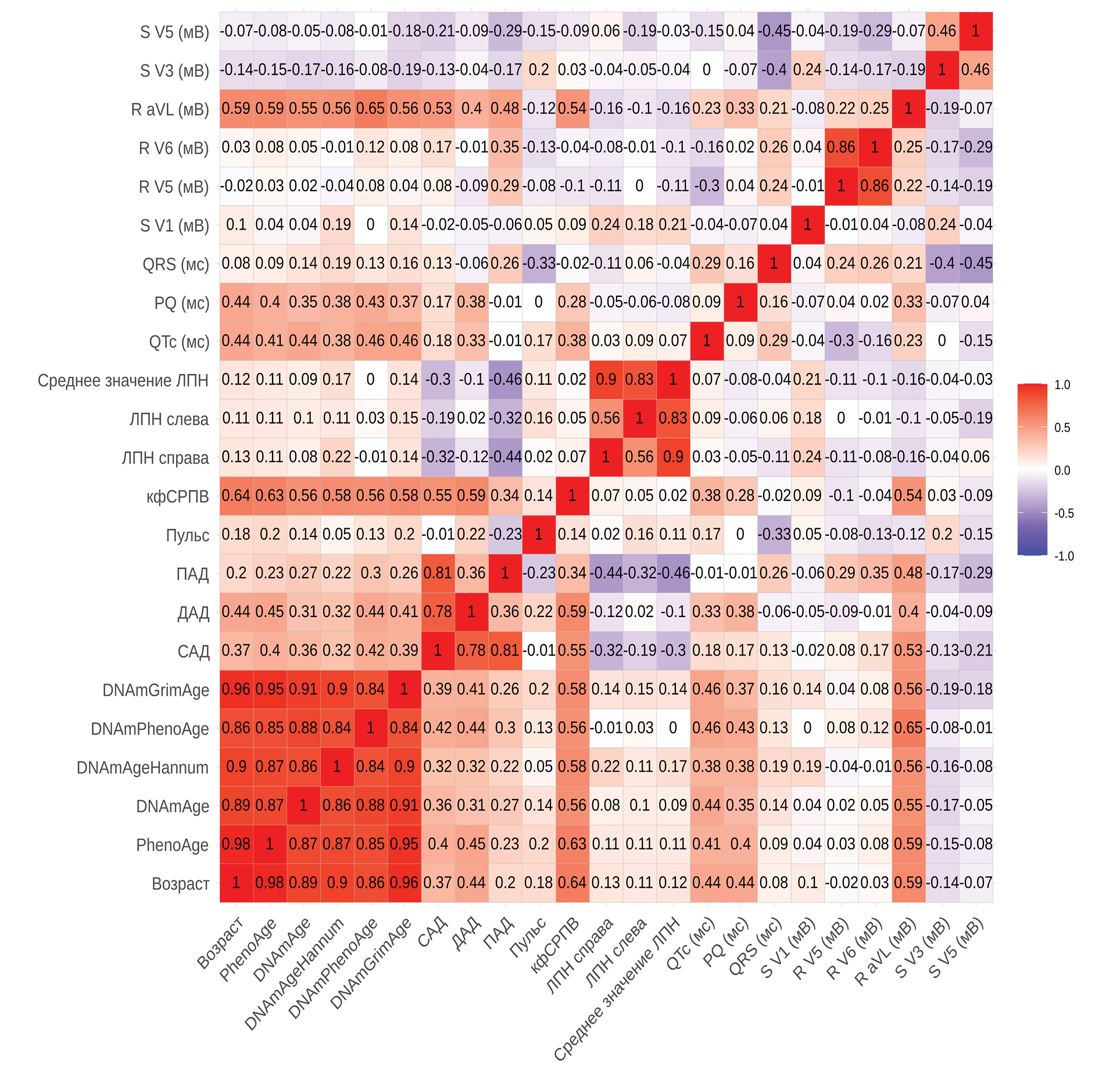 Рис. 1. Матрица корреляции Спирмена, представляющая собой коэффициенты корреляции между функциональными показателями сердечно-сосудистой системы и значениями возраста, полученными с помощью различных моделей, включая хронологический, эпигенетический и биологический возраст (n = 48). Эпигенетический и биологический возраст рассчитывали с использованием следующих моделей: DNAmAgeHannum [19], DNAmAge [11], DNAmPhenoAge [20], DNAGrimAge [21] и PhenoAge [20]. Значения p, связанные с коэффициентами корреляции, приведены в табл. S1 (см. Дополнительные материалы в электронном виде по DOI статьи и на сайте http://www.molecbio.ru/downloads/2024/6/supp_Ermakova_rus.rar).